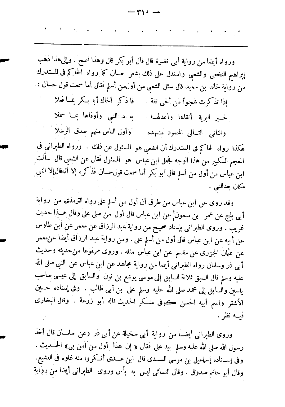 هكذا رواه الحاكم في المستدرك أن الشعبى هو المسئول عن ذلك وراه الطبراني في المعجم الكبير من هذا الوجه فجعل ابن عباس هو المسئول فقال عن الشعبى قال سألت ابن عباس من أول من أسلم قال أبو بكر أما سمعت قول حسان فذكره إلا أنه قال إلا النبى مكان بعد النبى.