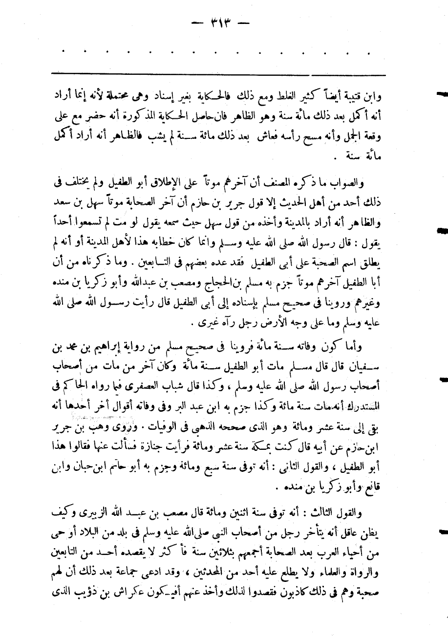 وأما كون وفاته سنة مائة فروينا في صحيح مسلم من رواية إبراهيم بن محمد بن سفيان قال: قال مسلم مات أبو الطفيل سنة مائة وكان آخر من مات من أصحاب أصحاب رسول الله صلى الله عليه وسلم وكذا قال شباب العصفرى فيما رواه الحاكم في المستدرك أنه مات سنة مائة وكذا جزم به ابن عبد البر وفي وفاته أقوال آخر أحدها أنه بقى إلى سنة عشر ومائة وهو الذي صححه الذهبى في الوفيات وروى وهب بن جرير ابن حازم عن أبيه قال كنت بمكة سنة عشر ومائة فرأيت جنازة فسألت عنها فقالوا هذا أبو الطفيل والقول الثاني أنه توفي سنة سبع ومائة وجزم به أبو حاتم ابن حبان وابن قانع وأبو زكريا بن منده.