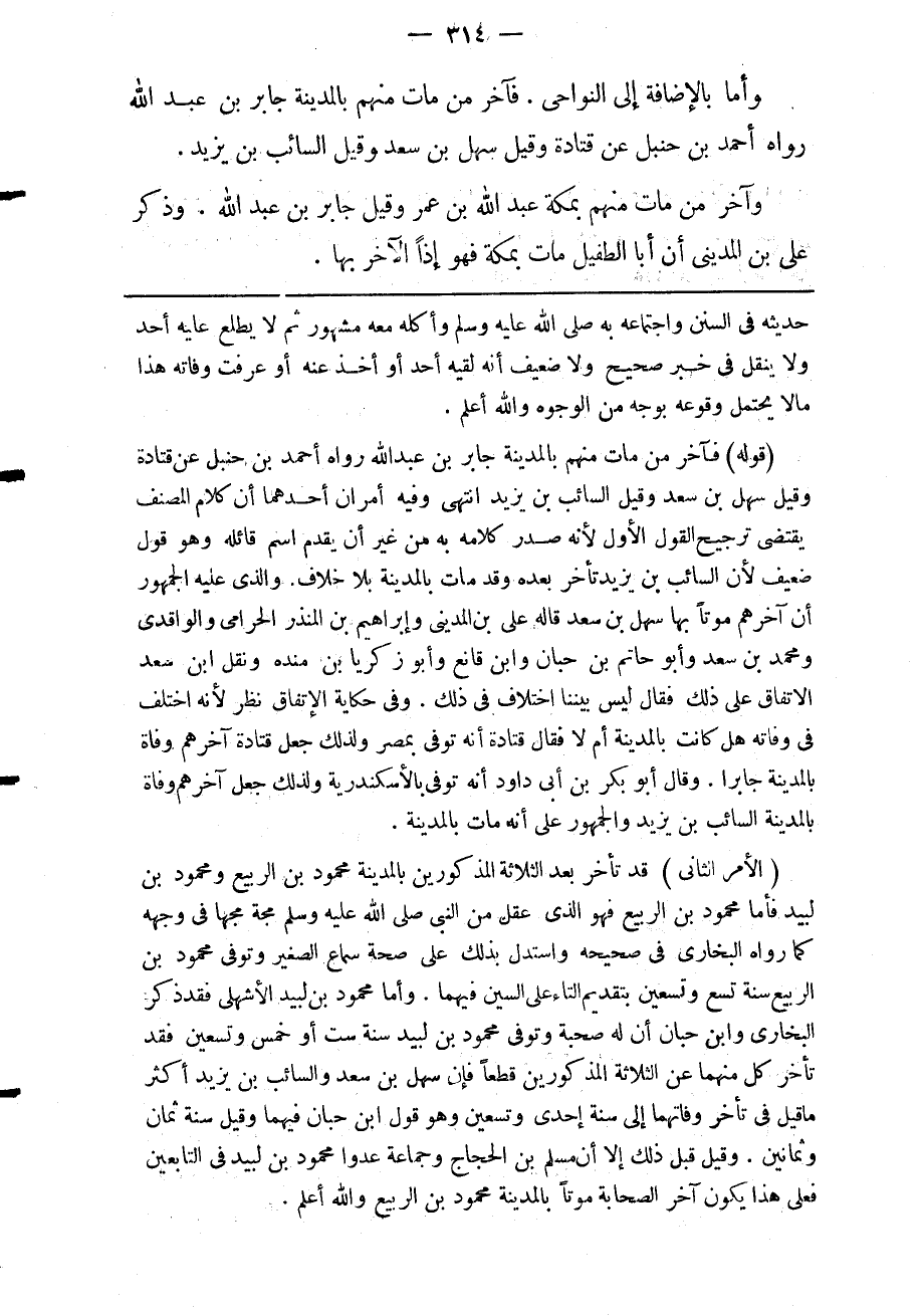 الأمر الثاني: قد تأخر بعد الثلاثة المذكورين بالمدينة ومحمود بن الربيع محمود بن لبيد فأما محمود بن الربيع فهو الذي عقل من النبي صلى الله عليه وسلم مجة مجها في وجهه كما رواه البخاري في صحيحه واستدل بذلك على صحة سماع الصغير وتوفي محمود بن الربيع سنة تسع وتسعين بتقديم التاء على السين فيهما وأما محمود بن لبيد الأشهلى فقد ذكر البخاري وابن حبان أن له صحبة وتوفي محمود بن لبيد سنة ست أو خمس وتسعين فقد تأخر كل منهما عن الثلاثة المذكورين قطعا فإن سهل بن سعد والسائب بن يزيد أكثر ما قيل ما تأخر وفاتهما إلى سنة إحدى وتسعين وهو قول ابن حبان فيهما وقيل سنة ثمان وثمانين وقيل قبل ذلك إلا أن مسلم بن الحجاج وجماعة عدوا محمود بن لبيد في التابعين فعلى هذا يكون آخر الصحابة موتا بالمدينة محمود بن الربيع والله أعلم.