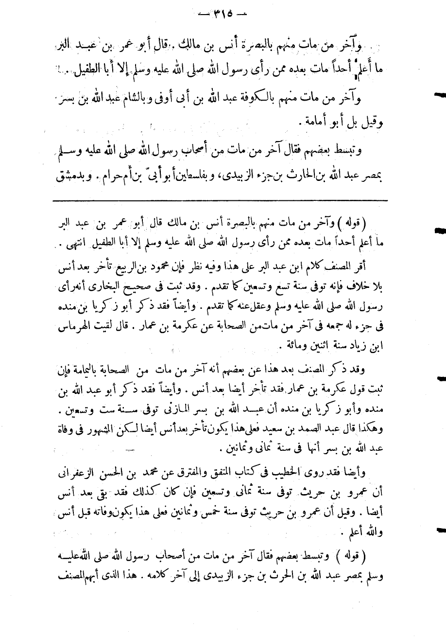 "قوله" وآخر من مات منهم بالبصرة أنس بن مالك قال أبو عمر بن عبد البر ما أعلم أحدا مات بعده ممن رأى رسول الله صلى الله عليه وسلم إلا أبا الطفيل انتهى.