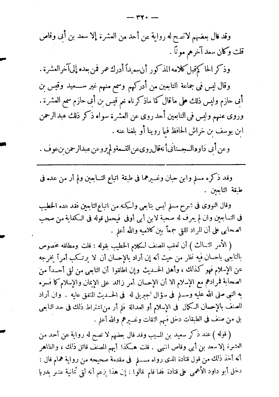 الأمر الثالث: أن تعقب المصنف لكلام الخطيب بقوله قلت ومطلقه مخصوص بالتابعى باحسان فيه نظر من حيث أنه إن أراد بالإحسان أن لا يرتكب أمرا يخرجه عن الإسلام فهو كذلك وأهل الحديث وإن اطلقوا أن التابعى من لقى أحدا من الصحابة فمرادهم مع الإسلام الا أن الإحسان أمر زائد على الإيمان والإسلام كما فسره به النبي صلى الله عليه وسلم في سؤال جبريل له في الحديث المتفق عليه وان أراد المصنف بالإحسان الكمال في الإسلام أو العدالة فلم أر من اشتراط ذلك في حد التابعى بل من صنف في الطبقات دخل فيهم التقات وغيرهم والله أعلم.