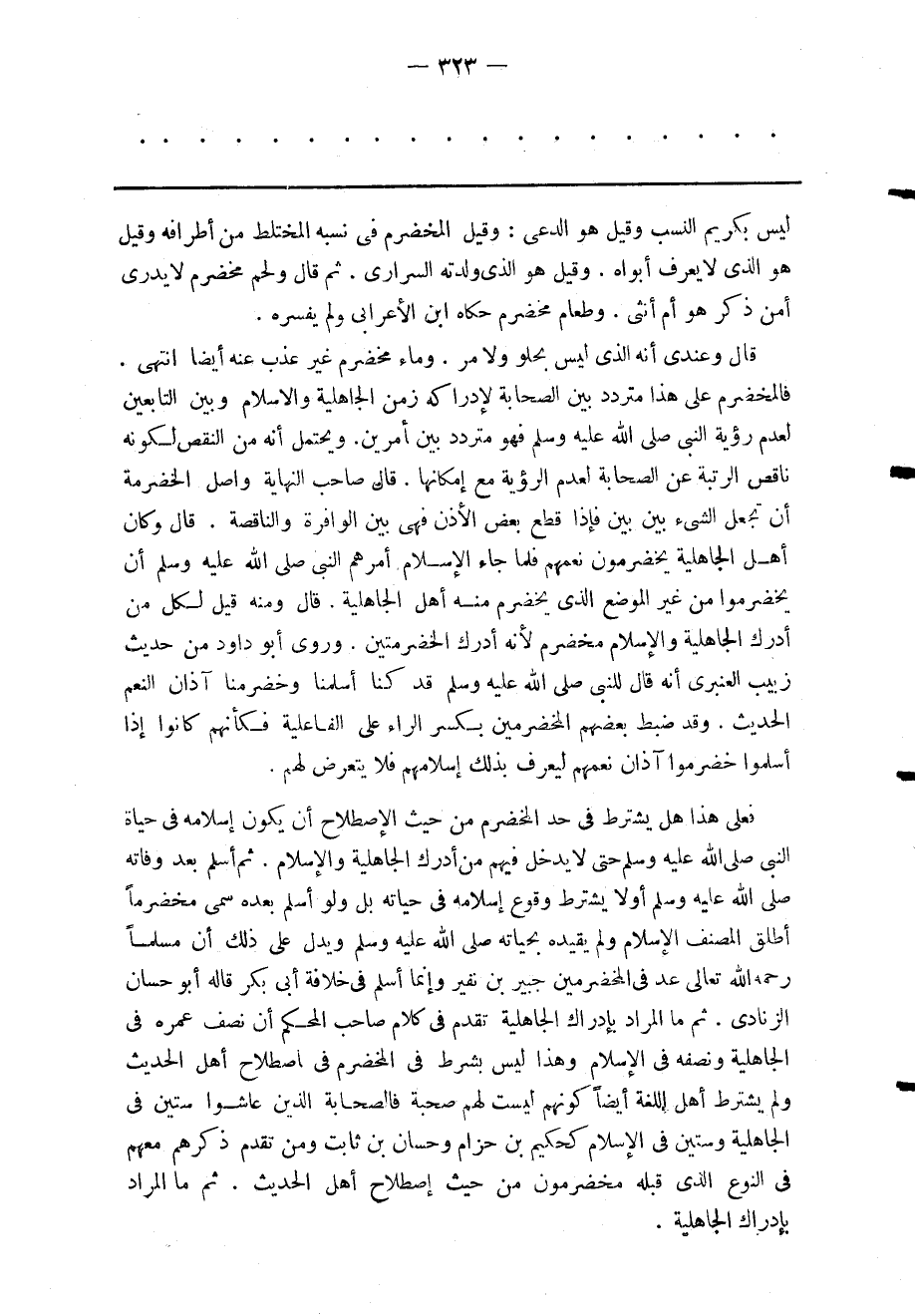 فعلى هذا هل يشترط في حد المخضرم من حيث الاصطلاح أن يكون إسلامه في حياة النبي صلى الله عليه وسلم حتى لا يدخل فيهم من أدرك الجاهلية والإسلام ثم أسلم بعد وفاته صلى الله عليه وسلم أولا يشترط وقوع إسلامه في حياته بل ولو أسلم بعده سمى مخضرما أطلق المصنف الإسلام ولم يقيده بحياته صلى الله عليه وسلم ويدل على ذلك أن مسلما رحمه الله تعالى عد في المخضرمين جبير بن نفير وإنما أسلم في خلافة أبي بكر قاله أبو حسان الزنادي ثم ما المراد بإدراك الجاهلية تقدم في كلام صاحب المحكم أن نصف عمره في الجاهلية ونصفه في الإسلام وهذا ليس بشرط في المخضرم في اصطلاح أهل الحديث ولم يشترط أهل اللغة أيضا كونهم ليست لهم صحبة فالصحابة الذين عاشوا ستين في الجاهلية وستين في الإسلام كحكيم بن حزام وحسان بن ثابت ومن تقدم ذكرهم معهم في النوع الذي قبله مخضرمون من حيث إصطلاح أهل الحديث ثم ما المرد بإدراك الجاهلية.