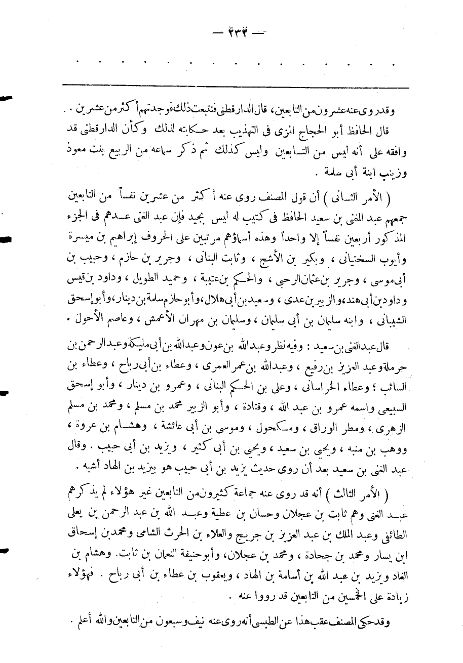 الأمر الثاني: أن قول المصنف روى عنه أكثر من عشرين نفسا من التابعين جمعهم عبد الغنى بن سعيد الحافظ في كتيب له ليس بجيد فإن عبد الغنى عدهم في الجزء المذكور أربعين نفسا إلا واحدا وهذه أسماؤهم مرتبين على الحروف إبراهيم بن ميسرة وأيوب السختيانى وبكير بن الأشج وثابت البنانى وجرير بن حازم وحبيب بن أبي موسى وجرير بن عثمان الرحبى والحكم بن عتيبة وحميد الطويل وداود بن قيس وداود بن أبي هند والزبير بن عدى وسعيد بن أبي هلال وأبو حازم سلمة بن دينار وأبو أسحاق الشيبانى وابنه سليمان بن أبي سليمان وسليمان بن مهران الأعمش وعاصم الأحول.