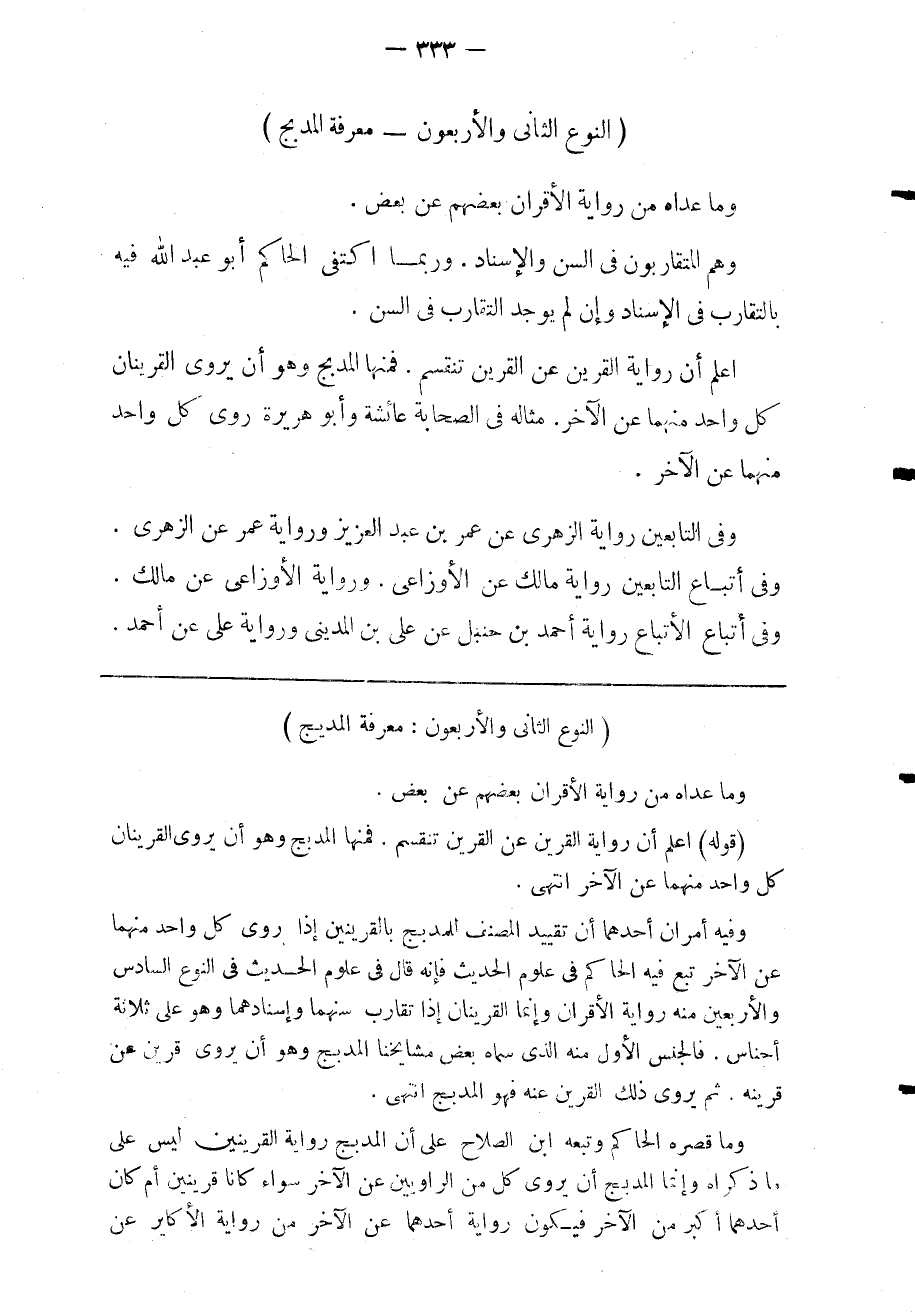 وما قصره الحاكم وتبعه ابن الصلاح على أن المدبج رواية القرينين ليس على ما ذكراه وإنما المدبج أن يروى كل من الراويين عن الآخر سواء كانا قرينين أم كان أحدهما أكبر من الآخر فيكون رواية أحدهما عن الآخر من رواية الأكابر عن