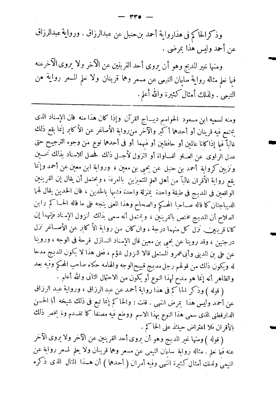 ومنها: غير المدبج وهو أن يروي أحد القرينين عن الآخر ولا يروي الآخر عنه فيما نعلم مثاله: رواية سليمان التيمي عن مسعر وهما قرينان ولا نعلم لمسعر رواية عن التيمي. ولذلك أمثال كثيرة والله أعلم.