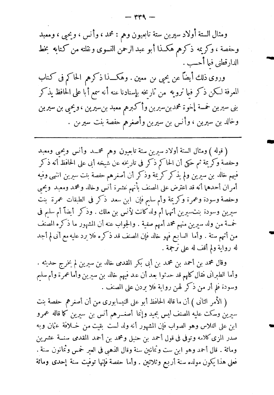 الأمر الثاني: أن ما قاله الحافظ أبو على النيسابوري من أن أصغرهم حفصة بنت سيرين وسكت عليه المصنف ليس بجيد وإنما أصغرهم أنس بن سيرين كما قاله عمرو ابن على الفلاس وهو الصواب فإن المشهور أنه ولد لست بقيت من خلافة عثمان وبه صدر المزى كلامه وتوفي في قول أحمد بن حنبل ومحمد بن أحمد المقدمى سنة عشرين ومائة قال أحمد وهو ابن ست وثمانين سنة وقال الذهبى في العبر خمس وثمانون سنة فعلى هذا يكون مولده سنة أربع وثلاثين وأما حفصة فإنها توفيت سنة إحدى ومائة.
