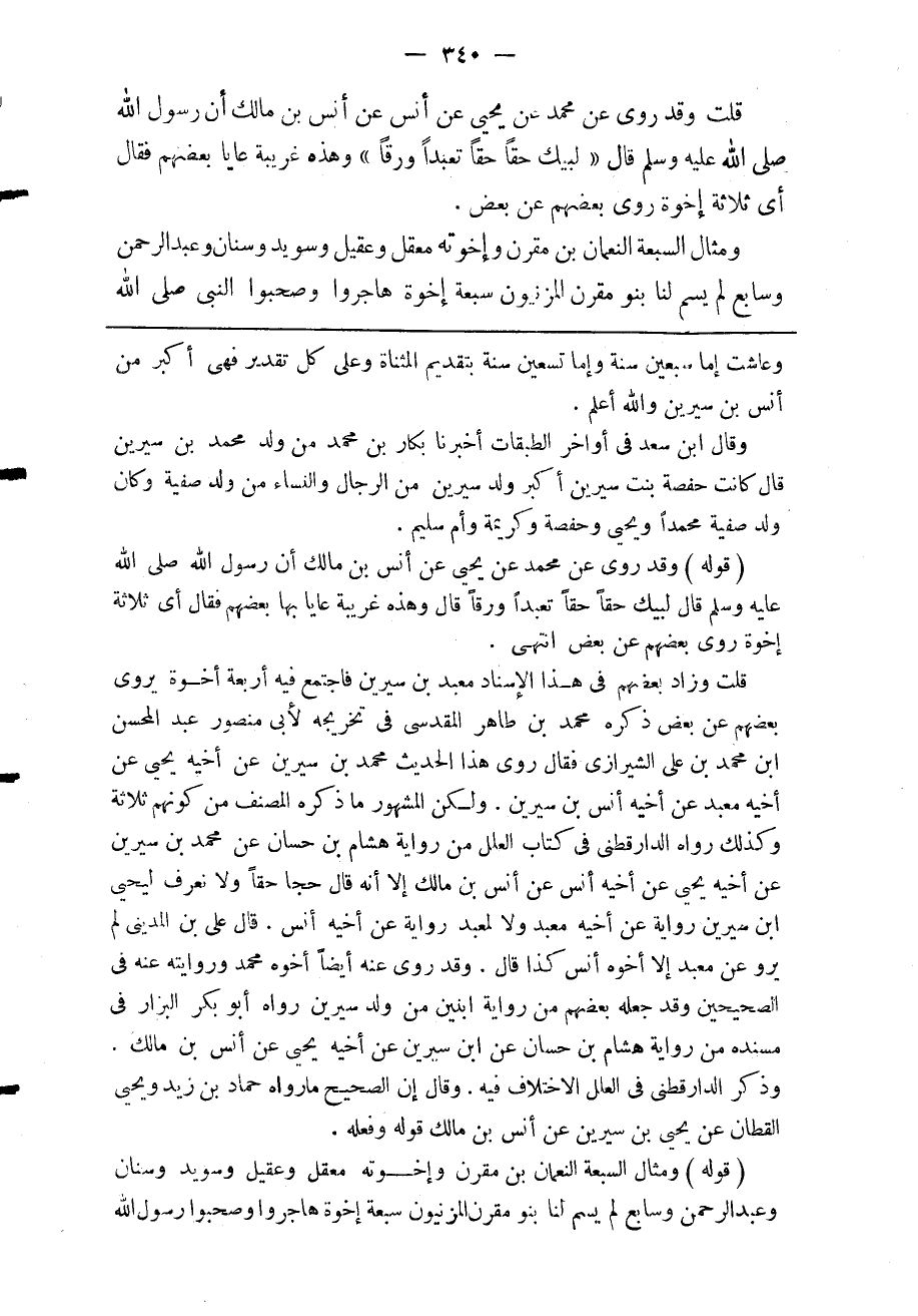 قلت وزاد بعضهم في هذا الإسناد معبد بن سيرين فاجتمع فيه أربعة أخوة يروى بعضهم عن بعض ذكره محمد بن طاهر المقدسي في تخريجه ل أبي منصور عبد المحسن ابن محمد بن على الشيرازى فقال روى هذا الحديث محمد بن سيرين عن أخيه يحيى عن أخيه معبد عن أخيه أنس بن سيرين ولكن المشهور ما ذكره المصنف من كونهم ثلاثة وكذلك رواه الدارقطني في كتاب العلل من رواية هشام بن حسان عن محمد بن سيرين عن أخيه يحيى عن أخيه أنس عن أنس بن مالك إلا أنه قال حجا حقا ولا نعرف ليحيى ابن سيرين رواية عن أخيه معبد ولا لمعبد رواية عن أخيه أنس قال على بن المدينى لم يرو عن معبد إلا أخوه أنس كذا قال وقد روى عنه أيضا أخوه محمد وروايته عنه في الصحيحين وقد جعله بعضهم من رواية ابنين من ولد سيرين رواه أبو بكر البزار في مسنده من رواية هشام بن حسان عن ابن سيرين عن أخيه يحيى عن أنس بن مالك وذكر الدارقطني في العلل الاختلاف فيه وقال إن الصحيح ما رواه حماد بن زيد ويحيى القطان عن يحيى بن سيرين عن أنس بن مالك قوله وفعله.