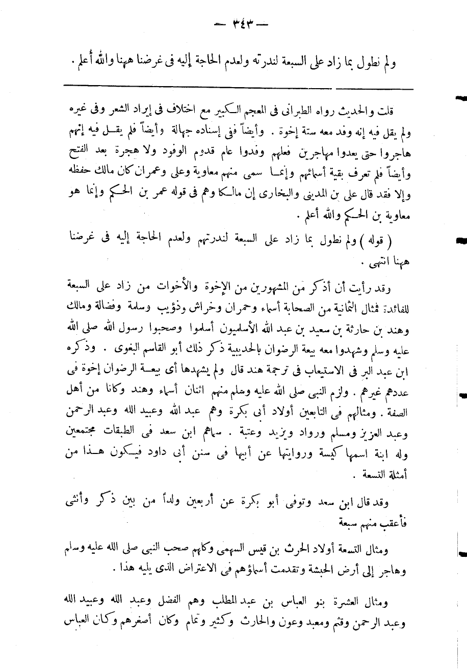 وقد رأيت أن أذكر من المشهورين من الإخوة والأخوات من زاد على السبعة للفائدة فمثال الثمانية من الصحابة أسماء وحمران وخراش وذؤيب وسلمة وفضالة ومالك وهند بن حارثة بن سعيد بن عبد الله الأسلميون أسلموا وصحبوا رسول الله صلى الله عليه وسلم وشهدوا معه بيعة الرضوان بالحديبية ذكر ذلك أبو القاسم البغوي وذكره ابن عبد البر في الاستيعاب في ترجمة هند قال ولم يشهدها أي بيعة الرضوان إخوة في عددهم غيرهم ولزم النبي صلى الله عليه وسلم منهم اثنان أسماء وهند وكانا من أهل الصفة ومثالهم في التابعين أولاد أبي بكرة وهم عبد الله وعبيد الله وعبد الرحمن وعبد العزيز ومسلم ورواد ويزيد وعتبة سماهم ابن سعد في الطبقات مجتمعين وله ابنة اسمها كيسة وروايتها عن أبيها في سنن أبي داود فيكون هذا من أمثلة التسعة.