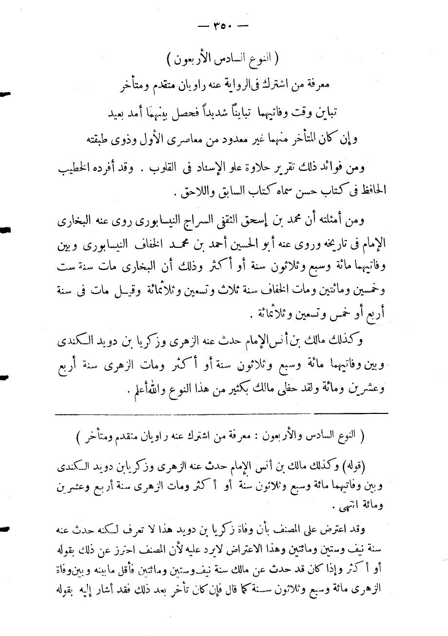 النوع السادس والأربعون: معرفة من اشترك في الرواية عنه راويان متقدم ومتأخر تباين وقت وفاتيهما تباينا شديدا فحصل بينهما أمد بعيد.