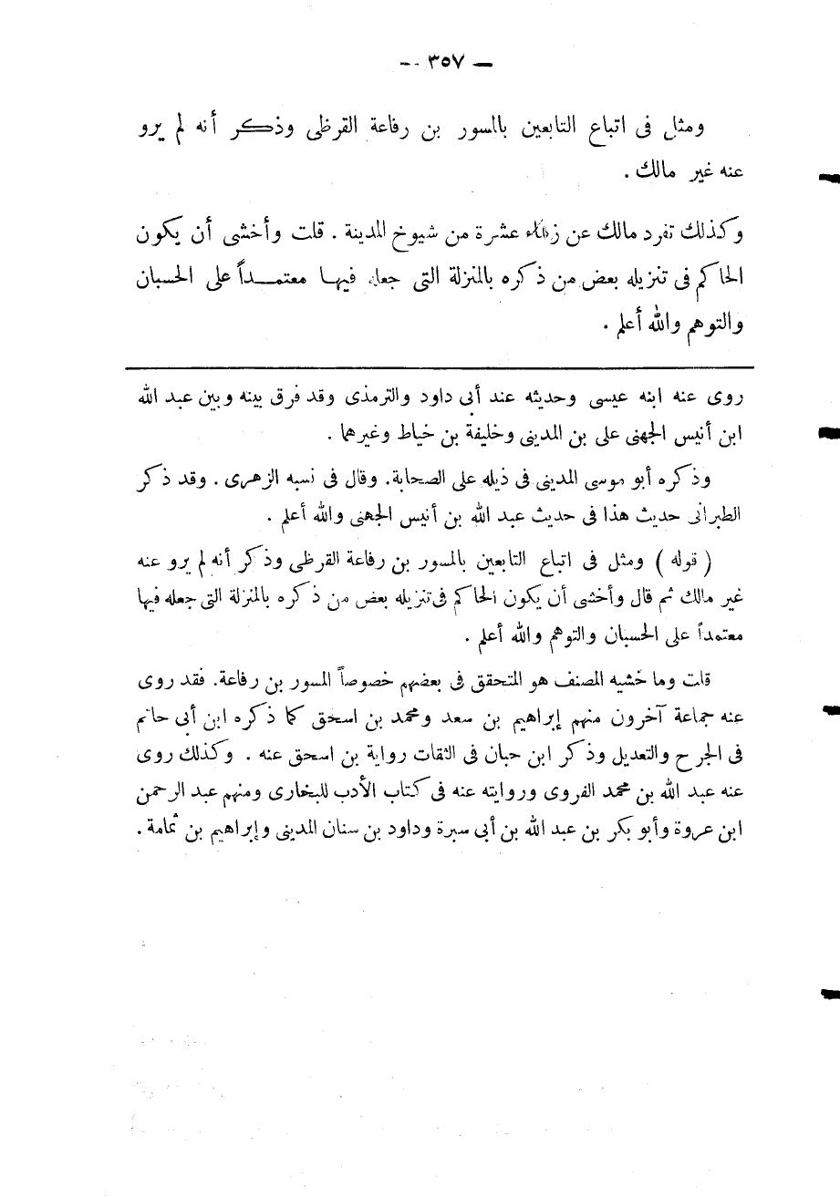 وكذلك تفرد مالك عن زهاء عشرة من شيوخ المدينة قلت: وأخشى أن يكون الحاكم في تنزيله بعض من ذكره بالمنزلة التي جعله فيها معتمدا على الحسبان والتوهم والله أعلم.