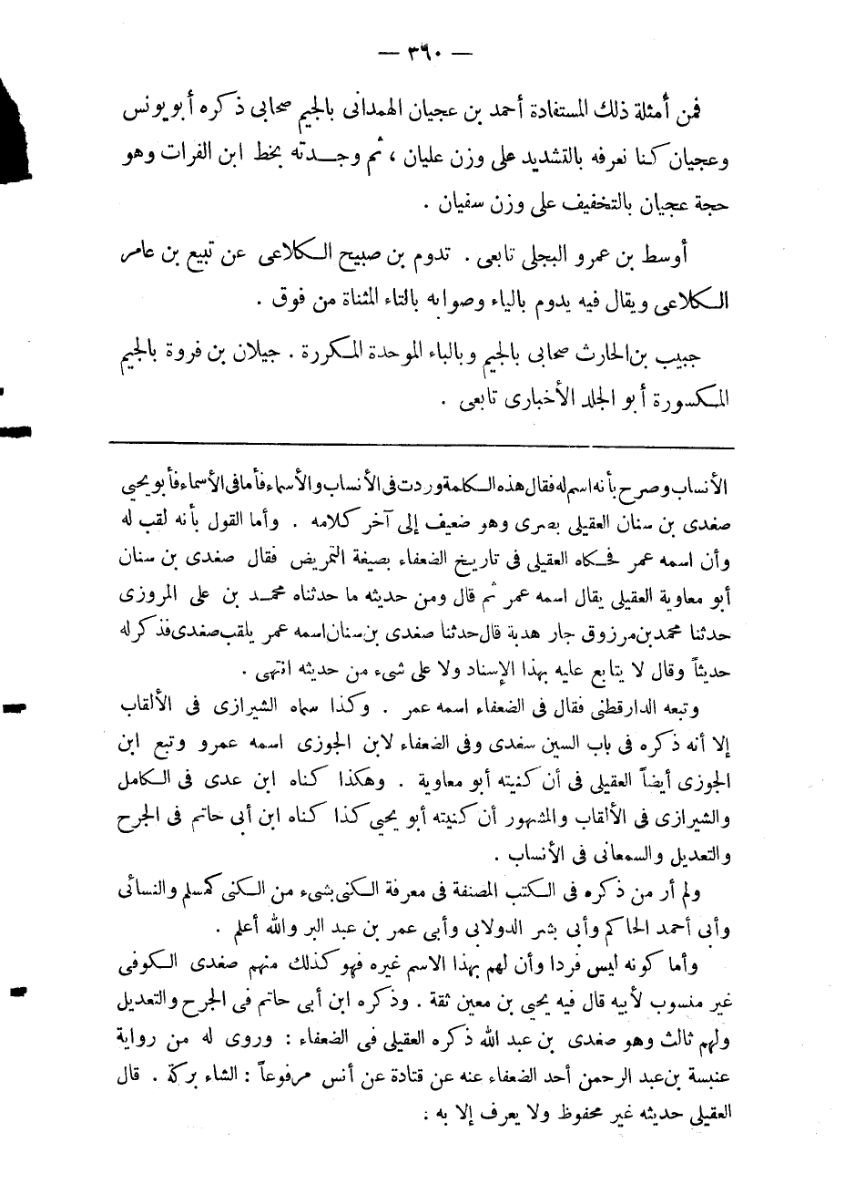 فمن أمثلة ذلك المستفادة: أحمد بن عجيان الهمداني بالجيم صحابي ذكره أبو يونس: وعجيان كنا نعرفه بالتشديد على وزن عليان. ثم وجدته بخط ابن الفرات وهو حجة عجيان بالتخفيف على وزن سفيان.