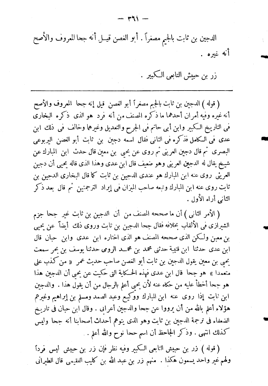 الأمر الثانى: أن ما صححه المصنف من أن الدجين بن ثابت غير جحا جزم الشيرازى فى الألقاب بخلافه فقال جحا الدجين بن ثابت وروى ذلك أيضا عن يحيى بن معبن ولكن الذى صححه المصنف هو الذى اختاره ابن عدى وابن حبان قال ابن عدى حدثنا ابن قتيبة حدثنى محمد بن محمد الرومى حدثنا يوسف بن بحر سمعت يحيى بن معين يقول الدجين بن ثابت أبو الغصن صاحب حديث عمر من كذب على متعمدا هو جحا قال ابن عدى فهذه الحكاية التى حكيت عن يحيى أن الدجين هذا هو جحا أخطأ عليه من حكاه عنه لأن يحيى أعلم بالرجال من أن يقول هذا والدجين ابن ثابت إذا روى عنه ابن المبارك ووكيع وعبد الصمد ومسلم بن إبراهيم وغيرهم هؤلاء أعلم بالله من أن يرووا عن جحا والدجين أعرابى وقال ابن حبان فى تاريخ الضعفاء فى ترجمة الدجين بن ثابت وهو الذى يتوهم أحداث أصحابنا أنه جحا وليس كذلك انتهى وذكر الجاحظ أن اسم جحا نوح والله أعلم.