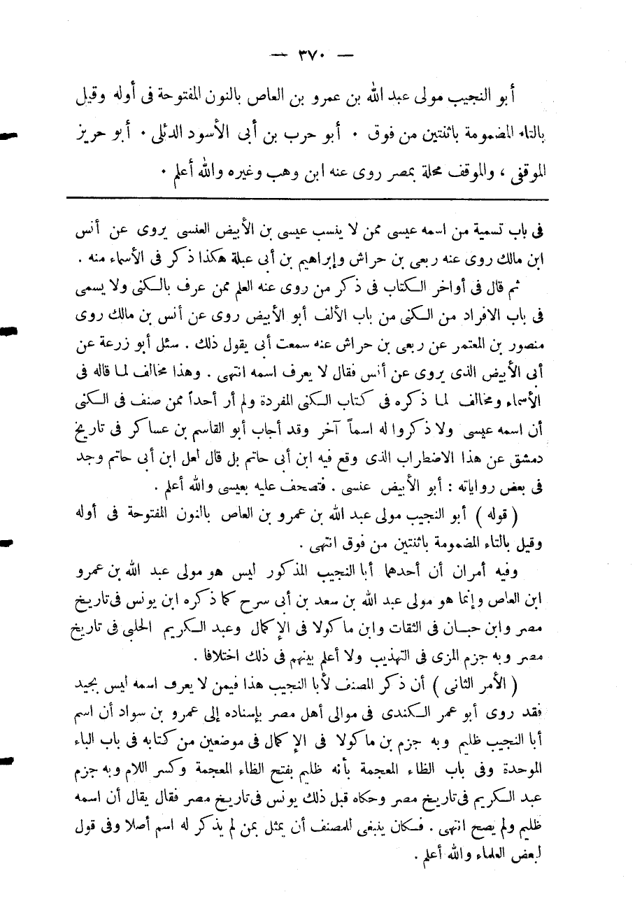 وفيه أمران أن أحدهما أبا النجيب المذكور ليس هو مولى عبد الله بن عمرو ابن العاص وإنما هو مولى عبد الله بن سعد بن أبى سرح كما ذكره ابن يونس فى تاريخ مصر وابن حبان فى الثقات وابن ماكولا فى الإكمال وعبد الكريم الحلبى فى تاريخ مصر وبه جزم المزى فى التهذيب ولا أعلم بينهم فى ذلك اختلافا.