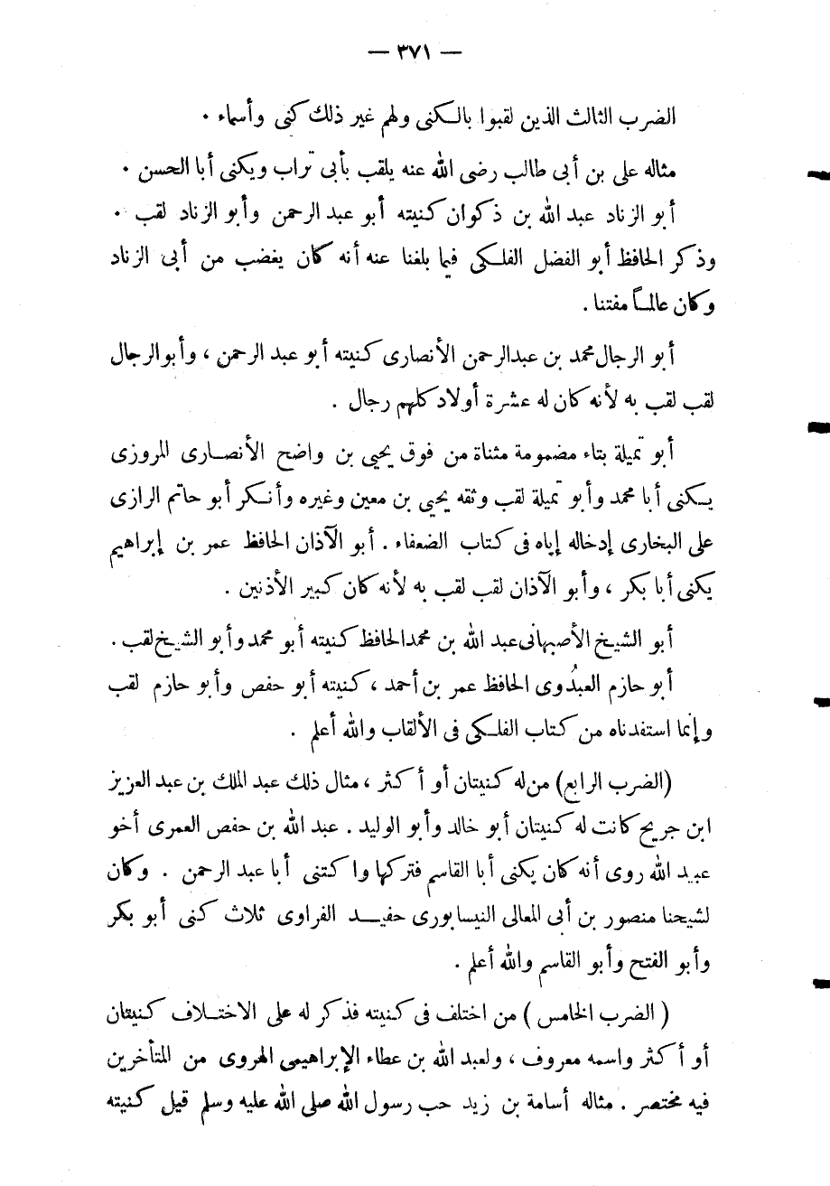 الضرب الرابع: من له كنيتان أو أكثر مثال ذلك عبد الملك بن عبد العزيز بن جريج كانت له كنيتان: أبو خالد وأبو الوليد عبد الله بن عمر بن حفص العمري أخو عبيد الله روي أنه كان يكنى أبا القاسم فتركها واكتنى أبا عبد الرحمن وكان لشيخنا منصور بن أبي المعالي النيسابوري حفيد الفراوي ثلاث كنى: أبو بكر وأبو الفتح وأبو القاسم والله أعلم.