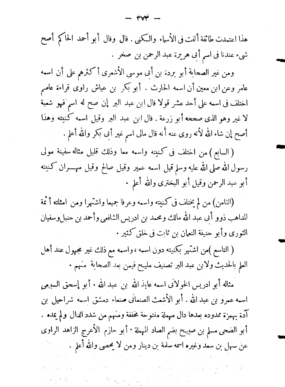 التاسع: من اشتهر بكنيته دون اسمه واسمه مع ذلك غير مجهول عند أهل العلم بالحديث. ولابن عبد البر تصنيف مليح فيمن بعد الصحابة منهم.