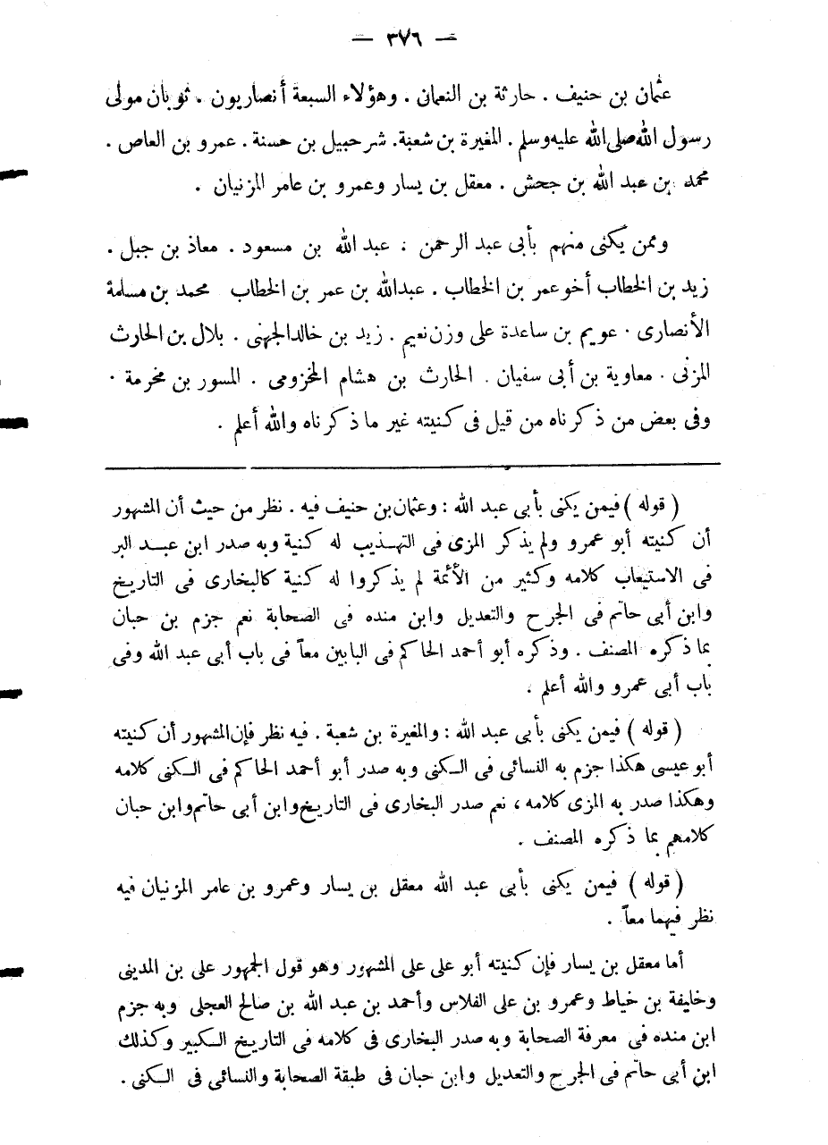 قوله فيمن يكنى بأبى عبد الله وعثمان بن حنيف فيه نظر من حيث أن المشهور أن كنيته أبو عمرو ولم يذكر المزى فى التهذيب له كنية وبه صدر ابن عبد البر فى الاستيعاب كلامه وكثير من الأئمة لم يذكروا له كنية كالبخارى فى التاريخ وابن أبى حاتم فى الجرح والتعديل وابن منده فى الصحابة نعم جزم بن حبان بما ذكره المصنف وذكره أبو أحمد الحاكم فى البابين معا فى باب أبى عبد الله وفى باب أبى عمرو والله أعلم.