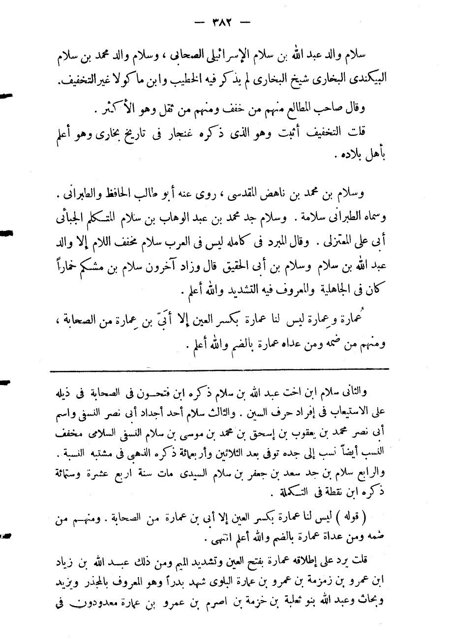 قلت يرد على إطلاقه عمارة بفتح العين وتشديد الميم ومن ذلك عبد الله بن زياد ابن عمرو بن زمزمة بن عمرو بن عمارة البلوى شهد بدرا وهو المعروف بالمجذر ويزيد وبحاث وعبد الله بنو ثعلبة بن خزمة بن أصرم بن عمرو بن عمارة معدودون في