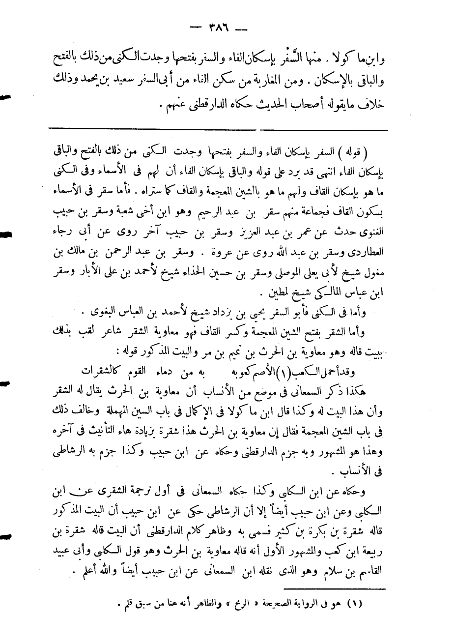 "قوله" السفر بإسكان الفاء والسفر بفتحها وجدت الكنى من ذلك بالفتح والباقى بإسكان الفاء انتهى قد يرد على قوله والباقى بإسكان الفاء أن لهم فى الأسماء وفى الكنى ما هو بإسكان القاف ولهم ما هو بالشين المعجمة والقاف كما ستراه فأما سقر فى الأسماء بسكون القاف فجماعة منهم سقر بن عبد الرحيم وهو ابن أخى شعبة وسقر بن حبيب الغنوى حدث عن عمر بن عبد العزيز وسقر بن حبيب آخر روى عن أبى رجاء العطاردى وسقر بن عبد الله روى عن عروة وسقر بن عبد الرحمن بن مالك بن مغول شيخ لأبى يعلى الموصلى وسقر بن حسين الحذاء شيخ لأحمد بن على الأبار وسقر ابن عباس المالكى شيخ لمطين.