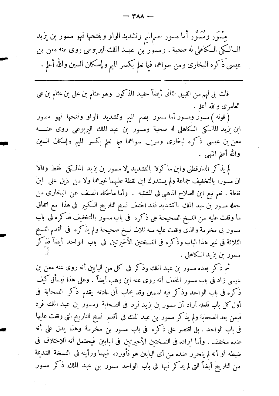 ثم ذكر بعده مسور بن عبد الملك وذكر في كل من البابين أنه روى عنه معن بن عيسى زاد في باب مسور المخفف أنه روى عنه ابن وهب أيضا وعلى هذا فيسأل كيف ذكره في باب الواحد وذكر فيه اسمين وقد يجاب بأن عادته يقدم ذكر الصحابة في أول كل باب فلعله أراد أن مسور بن يزيد فرد في الصحابة ومسور بن عبد الملك فرد فيمن بعد الصحابة ولم يذكر مسور بن عبد الملك في أقدم نسخ التاريخ التي وقفت عليها في باب الواحد بل اقتصر على ذكره في باب مسور بن مخرمة وهذا يدل على أنه عنده مخفف وأما إيراده في النسختين الأخيرتين فى البابين فيحتمل أنه للاختلاف فى ضبطه أو أنه لم يتحرر عنده من أى البابين هو فأورده فيهما ورأيته فى النسخة القديمة من التاريخ أيضا التى لم يذكر فيها فى باب الواحد مسور بن عبد الملك ذكر مسور
