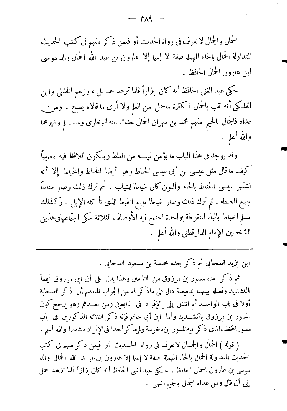 الحمال والجمال: لا نعرف في رواة الحديث أو فيمن ذكر منهم في كتب الحديث المتداولة الحمال بالحاء المهملة صفة لا اسما إلا هارون بن عبد الله الحمال والد موسى بن هارون الحمال الحافظ.