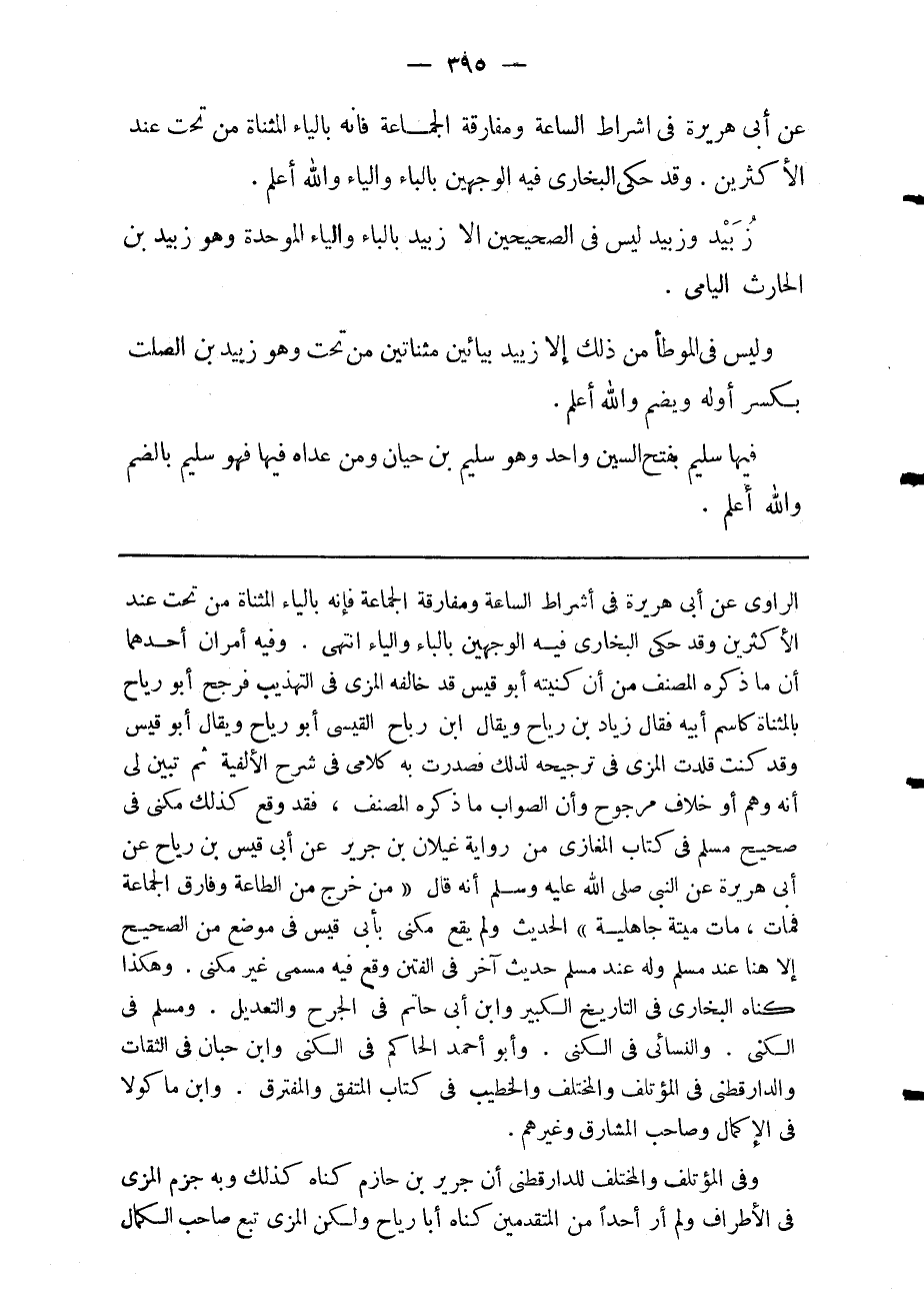 الراوي عن أبى هريرة في أشراط الساعة ومفارقة الجماعة فإنه بالياء المثناة من تحت عند الأكثرين وقد حكى البخاري فيه الوجهين بالباء والياء انتهى وفيه أمران أحدهما أن ما ذكره المصنف من أن كنيته أبو قيس قد خالفه المزي في التهذيب فرجح أبو رياح بالمثناة كاسم أبيه فقال زياد بن رياح ويقال ابن رباح القيسي أبو رياح ويقال أبو قيس وقد كنت قلدت المزي فى ترجيحه لذلك فصدرت به كلامى في شرح الألفية ثم تبين لي أنه وهم أو خلاف مرجوح وأن الصواب ما ذكره المصنف فقد وقع كذلك مكنى في صحيح مسلم في كتاب المغازي من رواية غيلان بن جرير عن أبى قيس بن رياح عن أبى هريرة عن النبي صلى الله عليه وسلم أنه قال: "من خرج من الطاعة وفارق الجماعة فمات مات ميتة جاهلية" الحديث ولم يقع مكنى بأبي قيس في موضع من الصحيح إلا هنا عند مسلم وله عند مسلم حديث آخر في الفتن وقع فيه مسمى غير مكنى وهكذا كناه البخاري في التاريخ الكبير وابن أبى حاتم في الجرح والتعديل ومسلم في الكنى والنسائي في الكنى وأبو أحمد الحاكم في الكنى وابن حبان في الثقات والدارقطني في المؤتلف والمختلف والخطيب في كتاب المتفق والمفترق وابن ماكولا في الإكمال وصاحب المشارق وغيرهم.