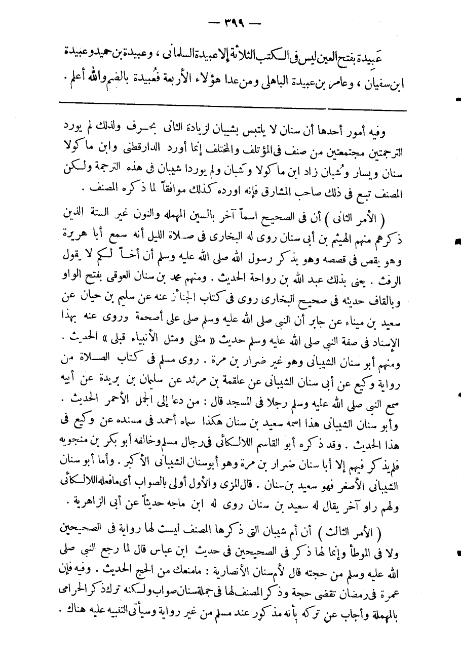 وفيه أمور: أحدها: أن سنان لا يلتبس بشيبان لزيادة الثاني بحرف ولذلك لم يورد الترجمتين مجتمعتين من صنف في المؤتلف والمختلف إنما أورد الدارقطني وابن ماكولا سنان ويسار وشبان زاد ابن ماكولا وشبان ولم يوردا شيبان في هذه الترجمة ولكن المصنف تبع في ذلك صاحب المشارق فإنه أورده كذلك موافقا لما ذكره المصنف.