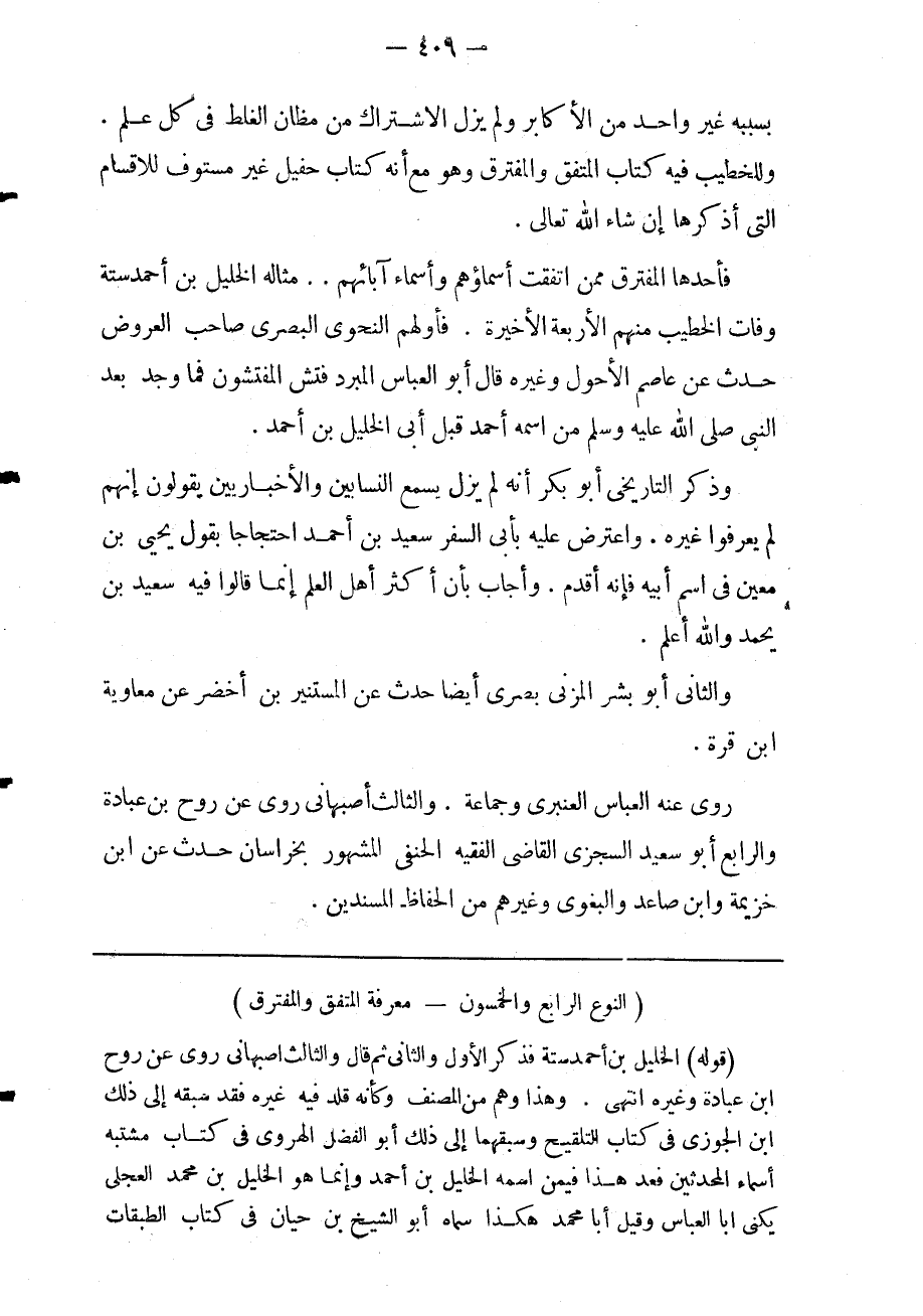 فأحدها: المفترق ممن اتفقت أسماؤهم وأسماء آبائهم مثاله: الخليل بن أحمد ستة وفات الخطيب منهم الأربعة الأخيرة. فأولهم النحوي البصري صاحب العروض حدث عن عاصم الأحول وغيره. قال أبو العباس المبرد: فتش المفتشون فما وجد بعد نبينا صلى الله عليه وسلم من اسمه أحمد قبل أبي الخليل بن أحمد.