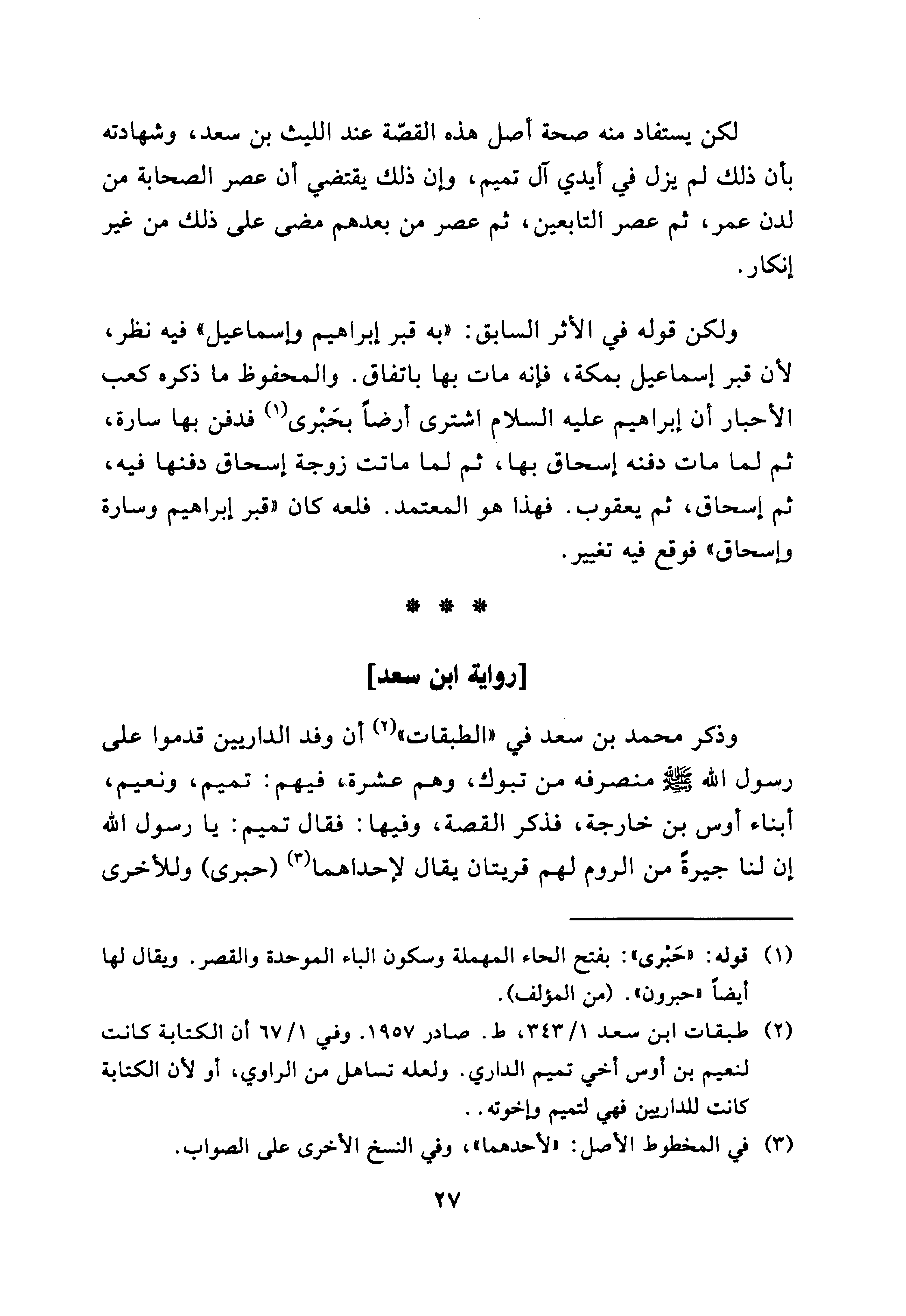 ولكن قوله في الأثر السابق: ((به قبر إبراهيم وإسماعيل)) فيه نظر، لأن قبر إسماعيل بمكة، فإنه مات بها باتفاق. والمحفوظ ما ذكره كعب الأحبار أن إبراهيم عليه السلام اشترى أرضاً بحبرى فدفن بها سارة، ثم لما مات دفنه إسحاق بها، ثم لما ماتت زوجة إسحاق دفنها فيه، ثم إسحاق، ثم يعقوب. فهذا هو المعتمد. فلعله كان ((قبر إبراهيم وسارة وإسحاق)) فوقع فيه تغيير.