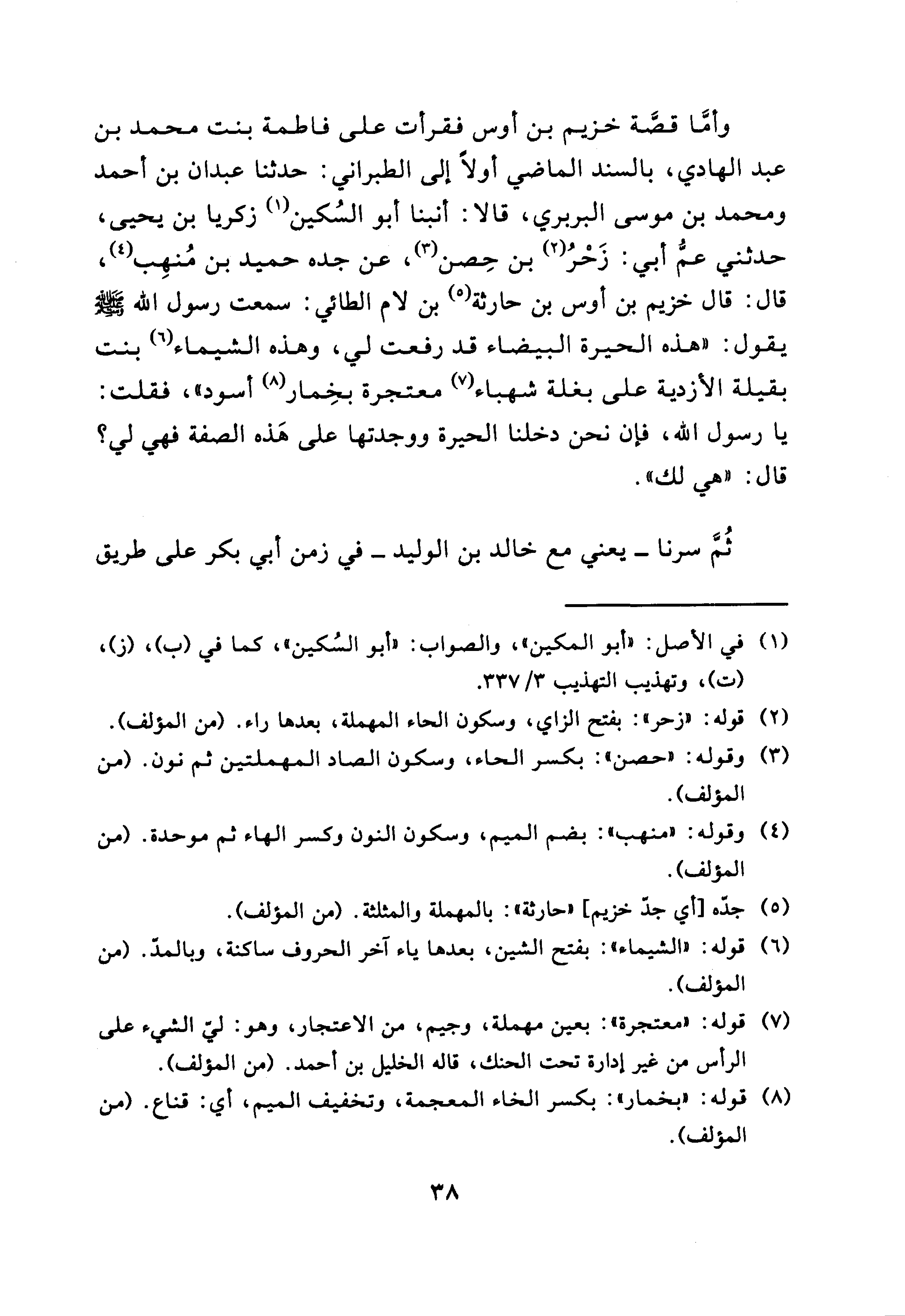 وأما قصة خزيم بن أوس فقرأت على فاطمة بنت محمد بن عبد الهادي، بالسند الماضي أولاً إلى الطبراني: حدثنا عبدان بن أحمد ومحمد بن موسى البربري، قالا: أنبأنا أبو السكين زكريا بن يحيى، حدثني عم أبي: زحر بن حصن، عن جده حميد بن منهب، قال: قال خزيم بن أوس بن حارثة بن لام الطائي: سمعت رسول الله صلى الله عليه وسلم يقول: ((هذه الحيرة البيضاء قد رفعت لي، وهذه الشيماء بنت بقيلة الأزدية على بغلة شهباء معتجرة بخمار أسود))، فقلت: يا رسول الله، فإن نحن دخلنا الحيرة ووجدتها على هذه الصفة فهي لي؟ قال: ((هي لك)).