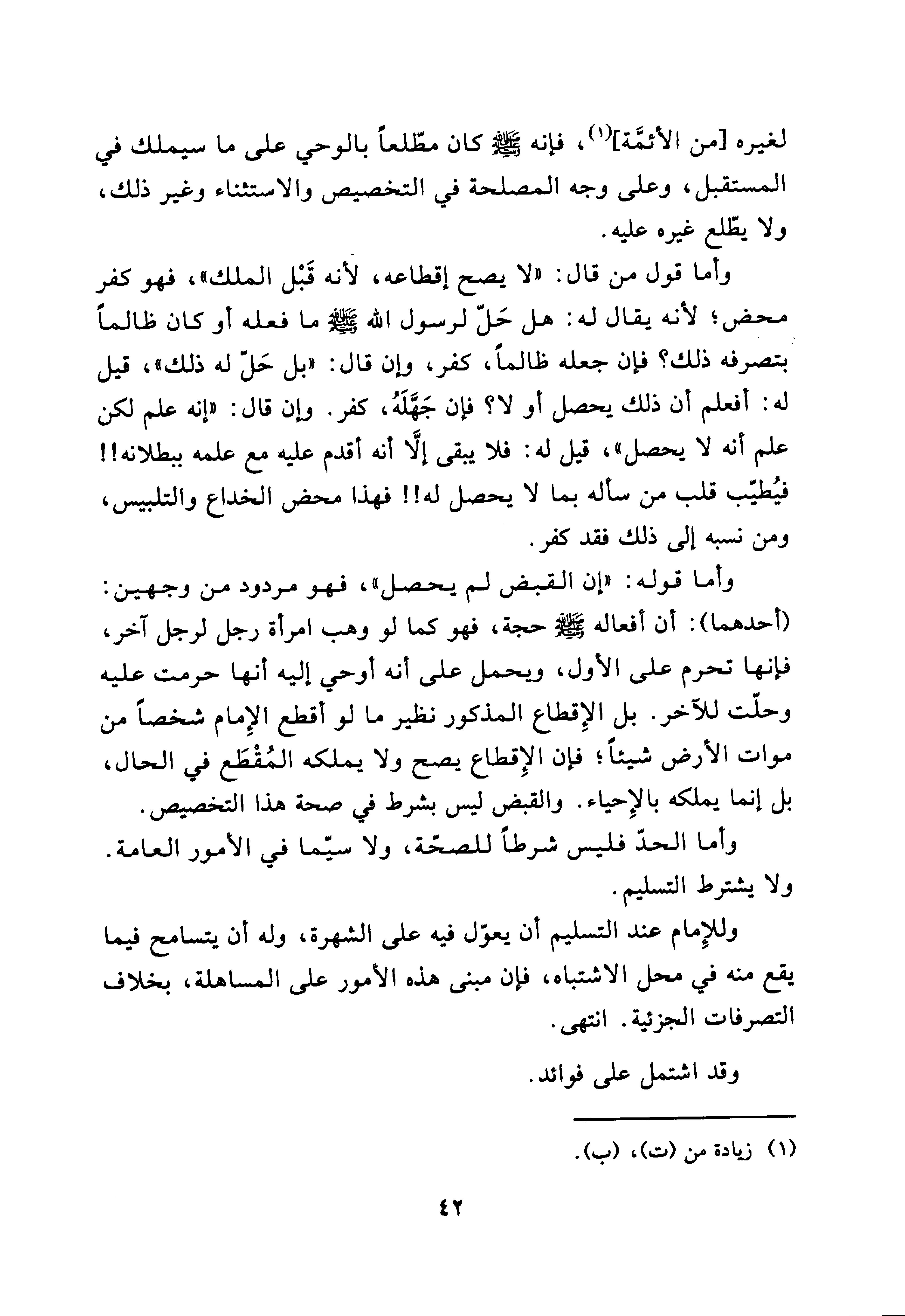 وأما قول من قال: ((لا يصح إقطاعه، لأنه قبل الملك))، فهو كفر محض؛ لأنه يقال له: هل حل لرسول الله صلى الله عليه وسلم ما فعله أو كان ظالماً بتصرفه ذلك؟ فإن جعله ظالماً، كفر، وإن قال: ((بل حل له ذلك))، قيل له: أفعلم أن ذلك يحصل أو لا؟ فإن جهله، كفر. وإن قال: ((إنه علم لكن علم أنه لا يحصل))، قيل له: فلا يبقى إلا أنه أقدم عليه مع علمه ببطلانه!! فيطيب قلب من سأله بما لا يحصل له!! فهذا محض الخداع والتلبيس، ومن نسبه إلى ذلك فقد كفر.