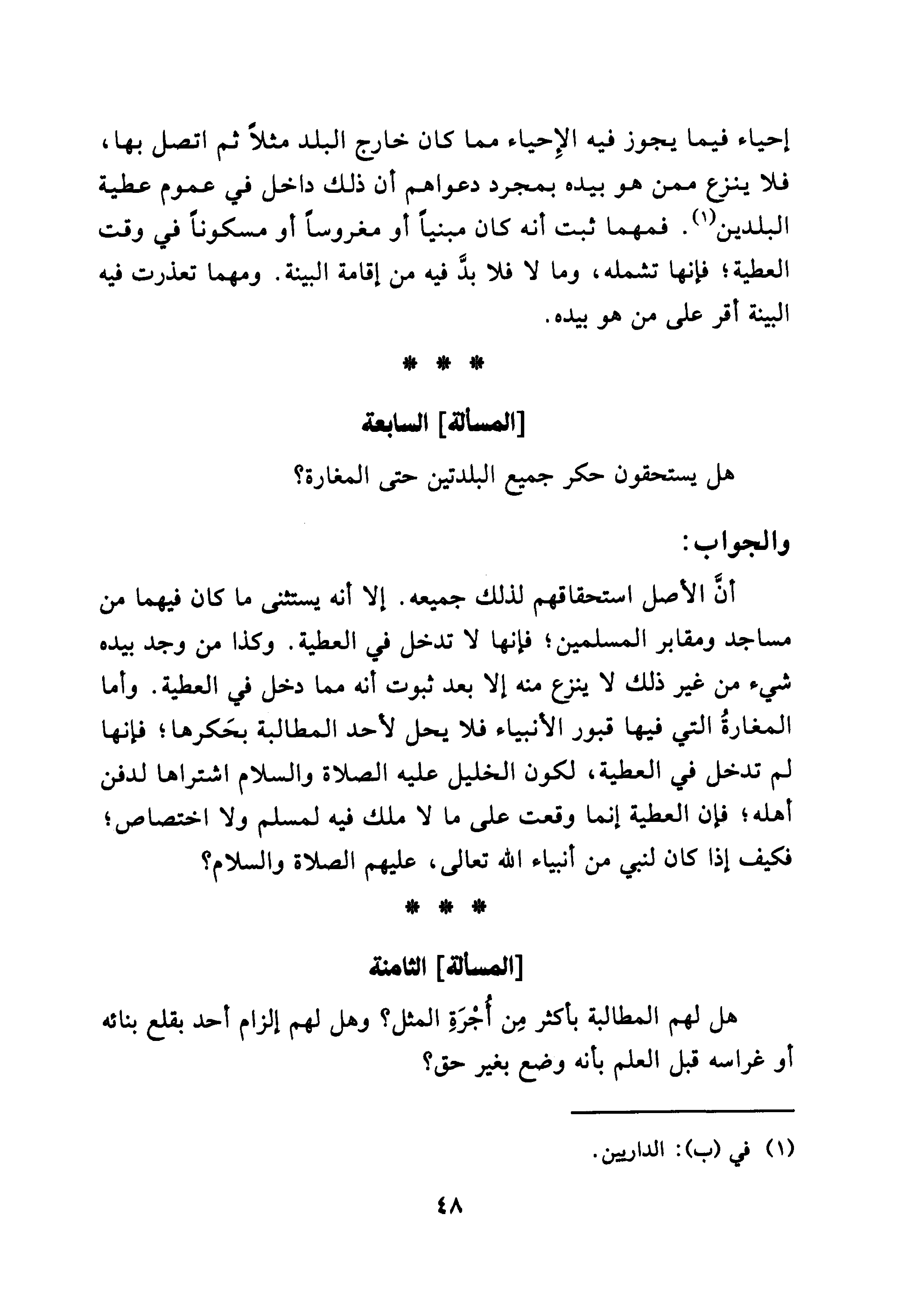 أن الأصل استحقاقهم لذلك جميعه. إلا أنه يستثنى ما كان فيهما من مساجد ومقابر المسلمين؛ فإنها لا تدخل في العطية. وكذا من وجد بيده شيء من غير ذلك لا ينزع منه إلا بعد ثبوت أنه مما دخل في العطية. وأما المغارة التي فيها قبور الأنبياء فلا يحل لأحد المطالبة بحكرها؛ فإنها لم تدخل في العطية، لكون الخليل عليه الصلاة والسلام اشتراها لدفن أهله؛ فإن العطية إنما وقعت على ما لا ملك فيه لمسلم ولا اختصاص؛ فكيف إذا كان لنبي من أنبياء الله تعالى، عليهم الصلاة والسلام؟