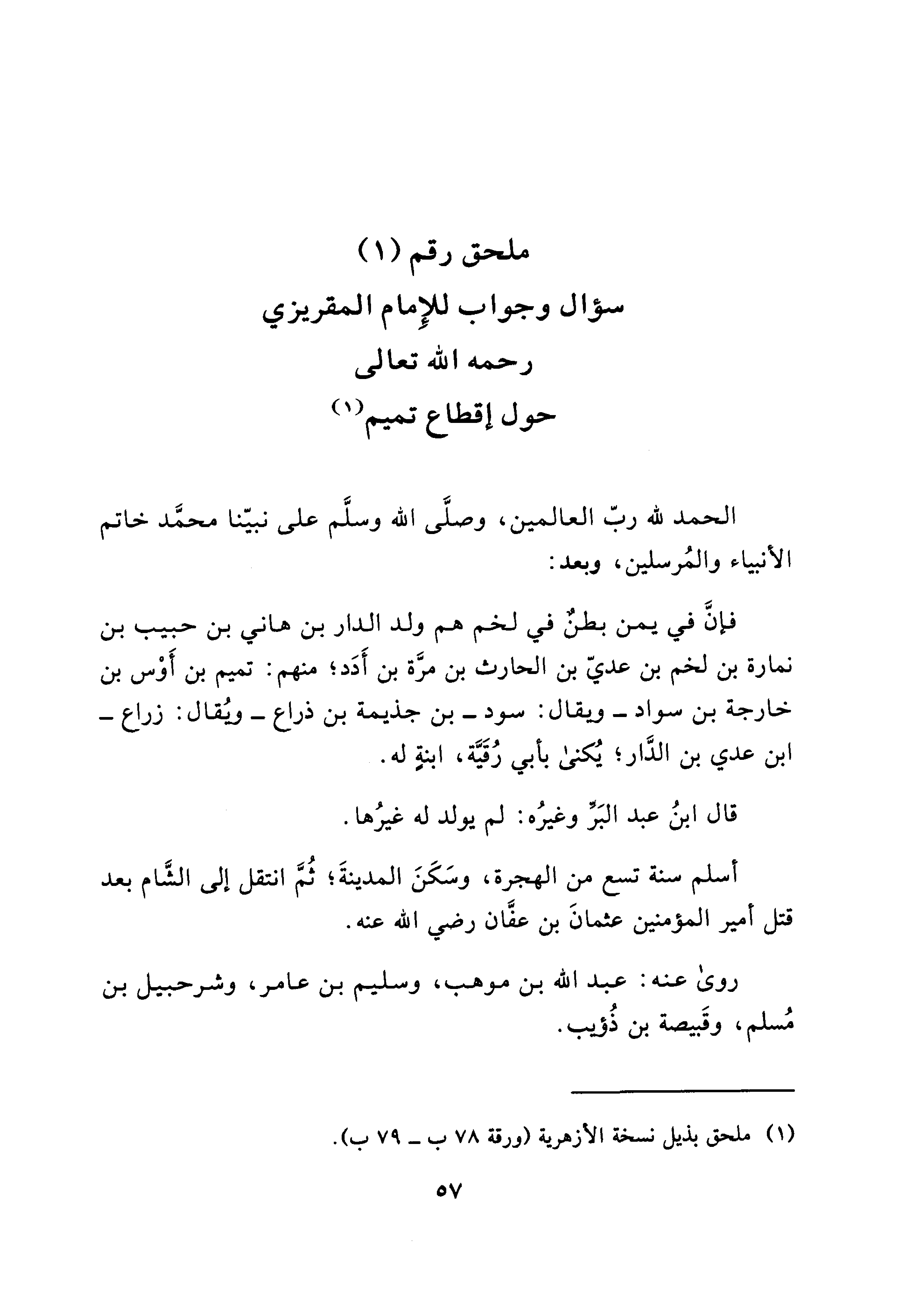 ملحق رقم (1) سؤال وجواب للإمام المقريزي رحمه الله تعالى حول إقطاع تميم