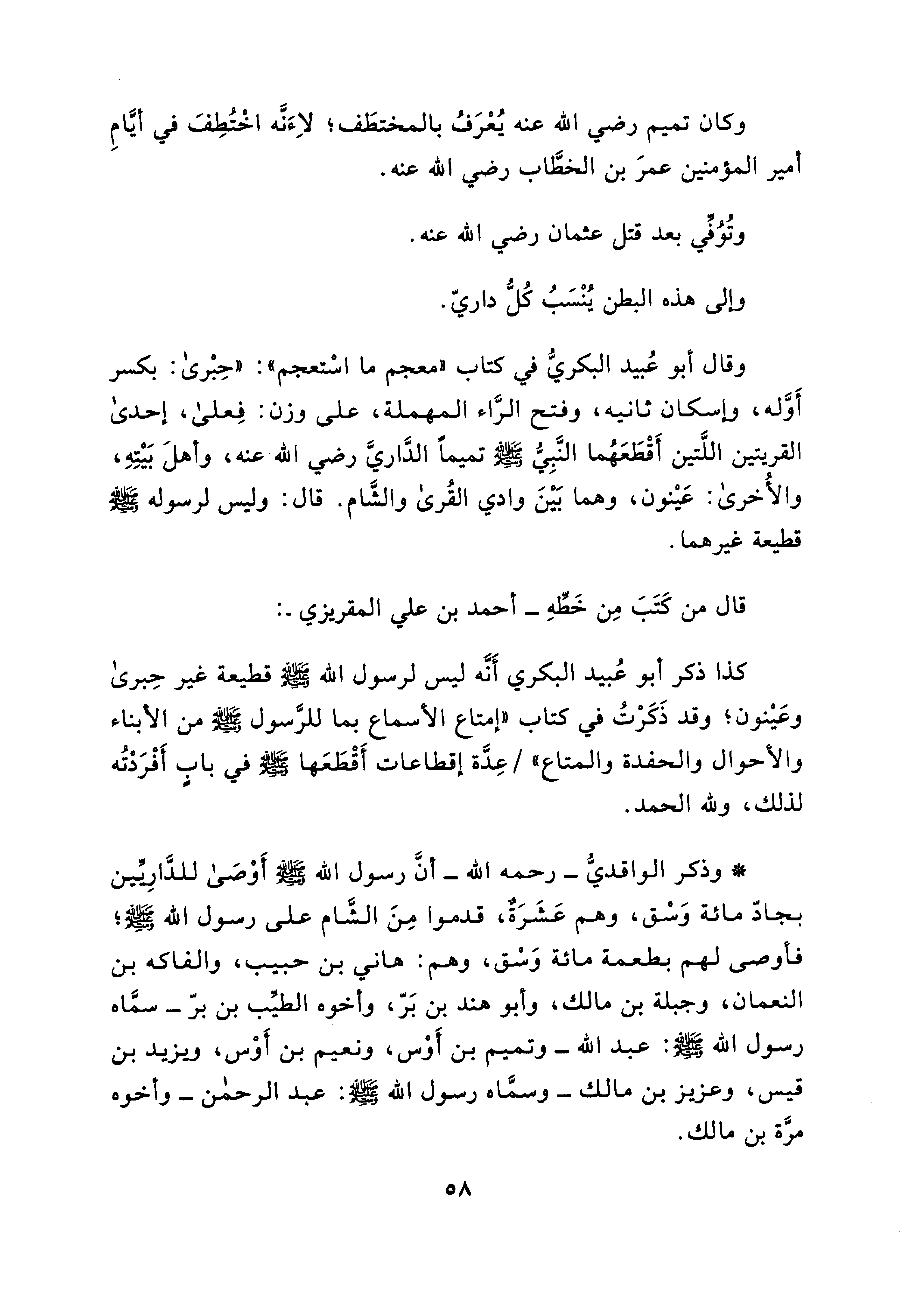 وذكر الواقدي -رحمه الله- أن رسول الله صلى الله عليه وسلم أوصى للداريين بجاد مائة وسق، وهم عشرةٌ، قدموا من الشام على رسول الله صلى الله عليه وسلم ؛ فأوصى لهم بطعمة مائة وسق، وهم: هاني بن حبيب، والفاكه بن النعمان، وجبلة بن مالك، وأبو هند بن بر، وأخوه الطيب بن بر -سماه رسول الله صلى الله عليه وسلم : عبد الله- وتميم بن أوس، ونعيم بن أوس، ويزيد بن قيس، وعزيز بن مالك -وسماه رسول الله صلى الله عليه وسلم : عبد الرحمن- وأخوه مرة بن مالك.