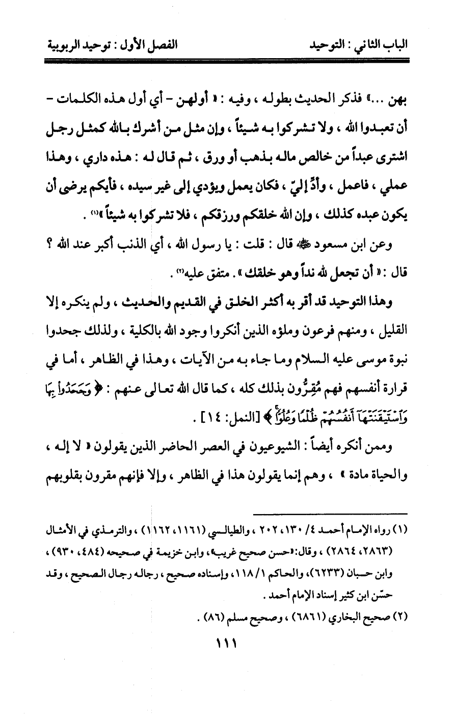 كالمعتزلة وكثير من الأشاعرة"1" إثبات هذه الصفة لله تعالى، وقدموا على هذه النصوص الشبهات العقلية التي أخذوها من علم الكلام الذي ورثوه عن فلاسفة اليونان، فجعلوا العقول البشرية حاكمة على كتاب الله وسنة رسوله صلى الله عليه وسلم، وهذا من الميل البيِّنِ عن الصراط المستقيم، وصدق الإمام الشافعي - رحمه الله - حيث قال: "ما أحد ارتدى بالكلام فأفلح" "2".