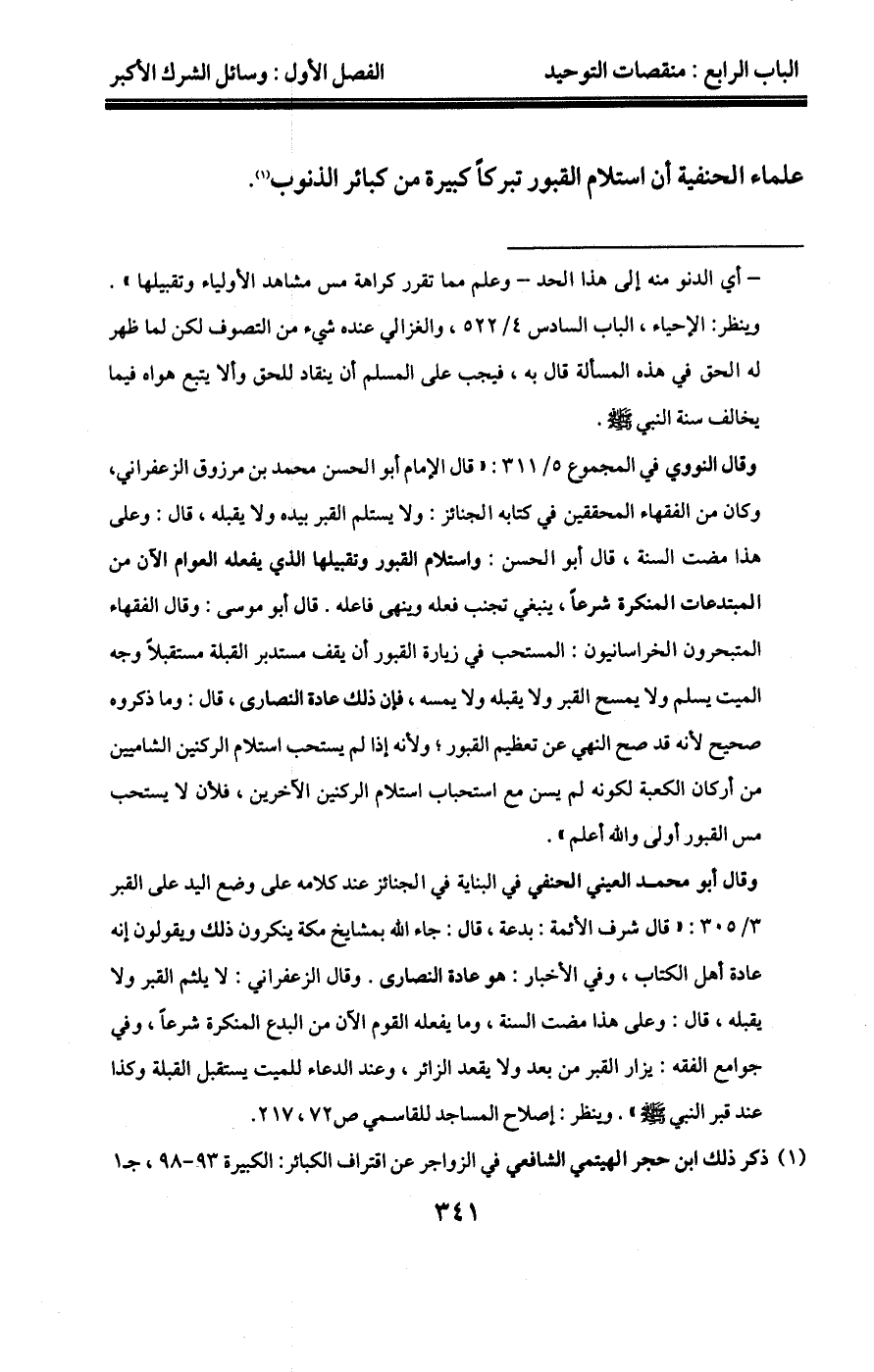 وقال الإمام النووي الشافعي في شرح مسلم 5/13:"قال العلماء: إنما نهى النبي صلى الله عليه وسلم عن اتخاذ قبره وقبر غيره مسجداً خوفاً من المبالغة في تعظيمه والافتتان به، فربما أدى ذلك إلى الكفر، كما جرى لكثير من الأمم الخالية".