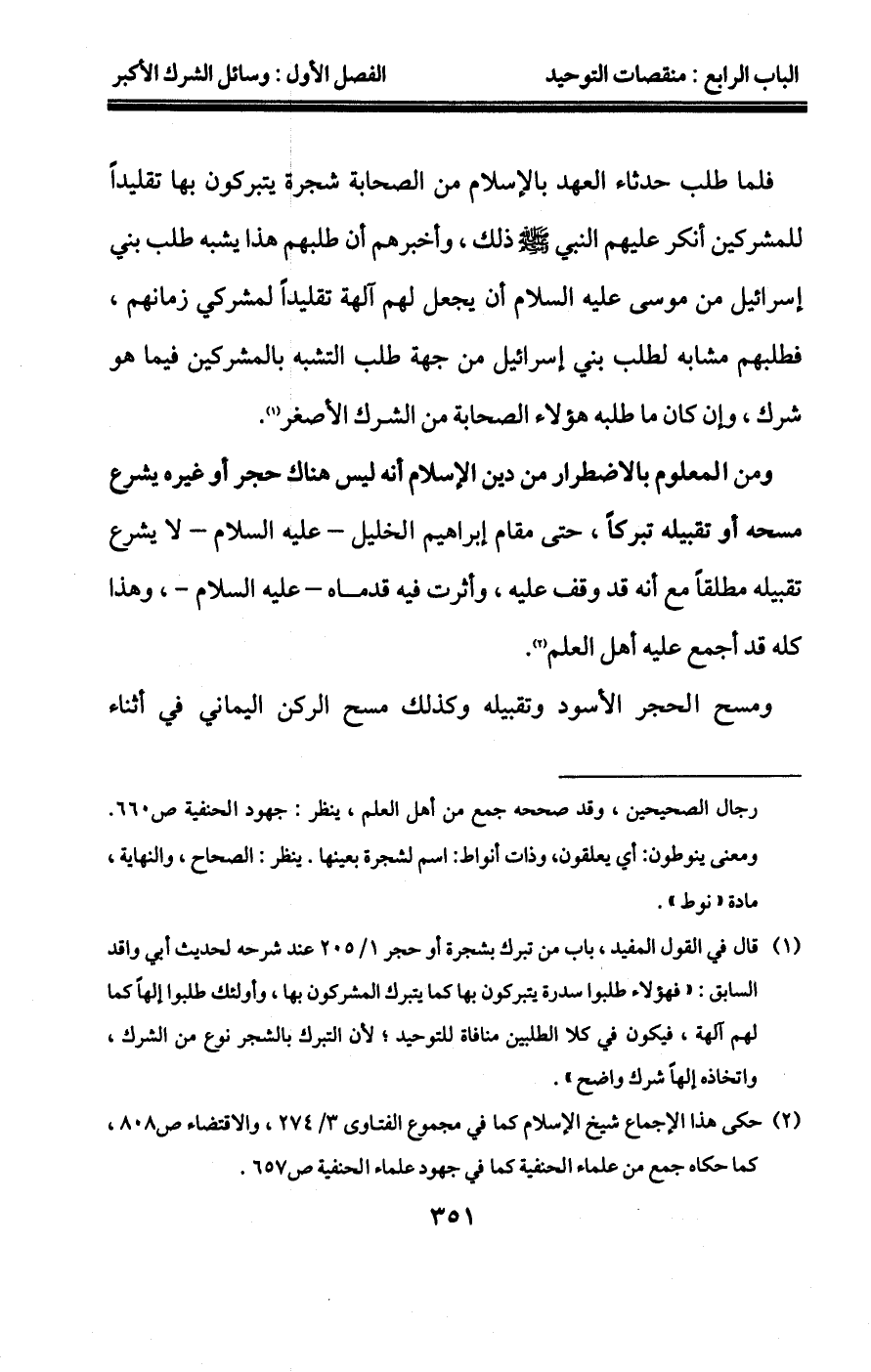كلا، لا يمكنهم ذلك، بل يمكنهم أن يأتوا بكثير من ذلك عن الخلوف التي خلفت من بعدهم، ثم كلما تأخر الزمان وطال العهد كان ذلك أكثر، حتى لقد وجد في ذلك عدة مصنفات ليس فيها عن رسول الله صلى الله عليه وسلم ولا عن الخلفاء الراشدين ولا عن الصحابة والتابعين حرف واحد من ذلك، بل فيها من خلاف ذلك كثير كما سبق من الأحاديث المرفوعة التي من جملتها قوله عليه الصلاة والسلام: كنت نهيتكم عن زيارة القبور فمن أراد أن يزور فليزر ولا تقولوا هجراً أي فحشاً. وأي فحش أعظم من الشرك عندها قولاً وفعلاً. وأما آثار الصحابة فأكثر من أن يحاط بها، ومن ذلك ما في صحيح البخاري أن عمر بن الخطاب رأى أنس بن مالك رضي الله عنه يصلي عند القبر، فقال: القبر القبر". انتهى كلامه رحمه الله. وأثر عمر هذا رواه البخاري في الصلاة "فتح1/523" تعليقاً. ووصله عبد الرزاق "1581" بإسناد حسن، رجاله رجال الصحيحين، وزاد في آخره قال ثابت: فكان أنس بن مالك يأخذ بيدي إذا أراد أن يصلي فيتنحى عن القبور، وللأثر طرق أخرى عند ابن حجر في التغليق 2/229، 230، وعند غيره. وصحح بعضها الألباني في التحذير ص26، وينظر: عمدة القاري 4/172.