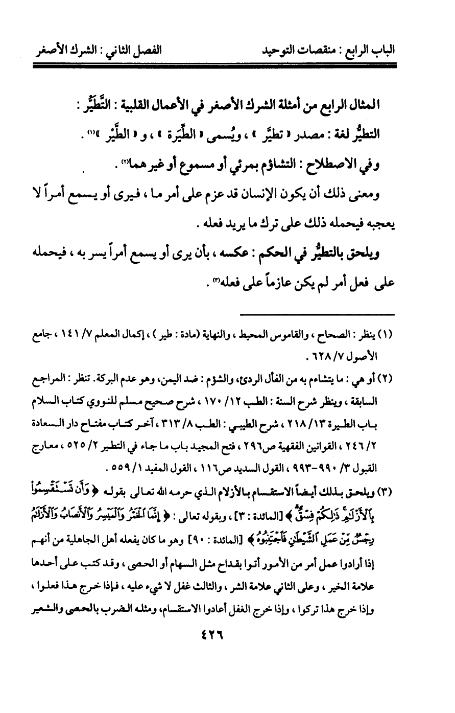 أو النعمة لغير الله تعالى من الأشياء التي جعلها الله تعالى سبباً كقول بعضهم: "هذا الخير من عرق الجبين"، أو "لولا فلان لم يحصل كذا"، ونحوها مما ينهى عنها، وقد ذكر بعضهم كابن القيم في مدارج السالكين 1/373 أن هذا من الشرك الأصغر، وذكر ابن رجب في لطائف المعارف: وظائف شهر صفر ص70 أنه من الشرك الخفي، وقال القرطبي في تفسير قوله تعالى: {وَمَا يُؤْمِنُ أَكْثَرُهُمْ بِاللَّهِ إِلَّا وَهُمْ مُشْرِكُونَ} [يوسف: 106] : "قيل: معناها: أنهم يدعون الله ينجيهم من الهلكة، فإذا أنجاهم قال قائلهم: لولا فلان ما نجونا، ولولا الكلب لدخل علينا اللص، ونحو هذا، فيجعلون نعمة الله منسوبة إلى فلان، ووقايته منسوبة إلى الكلب، وقد يقع في هذا القول كثير من عوام المسلمين".