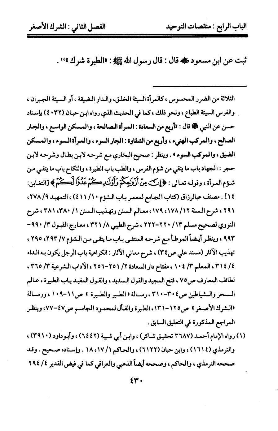 "2" قال في الفروع 2/163: "وإضافة المطر إلى النوء دون الله كفر إجماعاً ". وهذا شرك في الربوبية، ومن الشرك الأكبر في هذا الباب: أن يدعو النجم أن ينزل الغيث، فهذا شرك أكبر في الربوبية والألوهية، وقد سبق الكلام على نحو من هذا عند الكلام على شرك الدعاء في الباب السابق، وينظر الأم 1/252، الأنواء لابن قتيبة، التمهيد 16/268، إكمال المعلم 1/330، شرح مسلم للنووي 2/60، الأذكار للنووي ص308، تنبيه الغافلين ص192، مغني المحتاج 1/326، الفتاوى الكبرى 1/393، لطائف المعارف ص70.