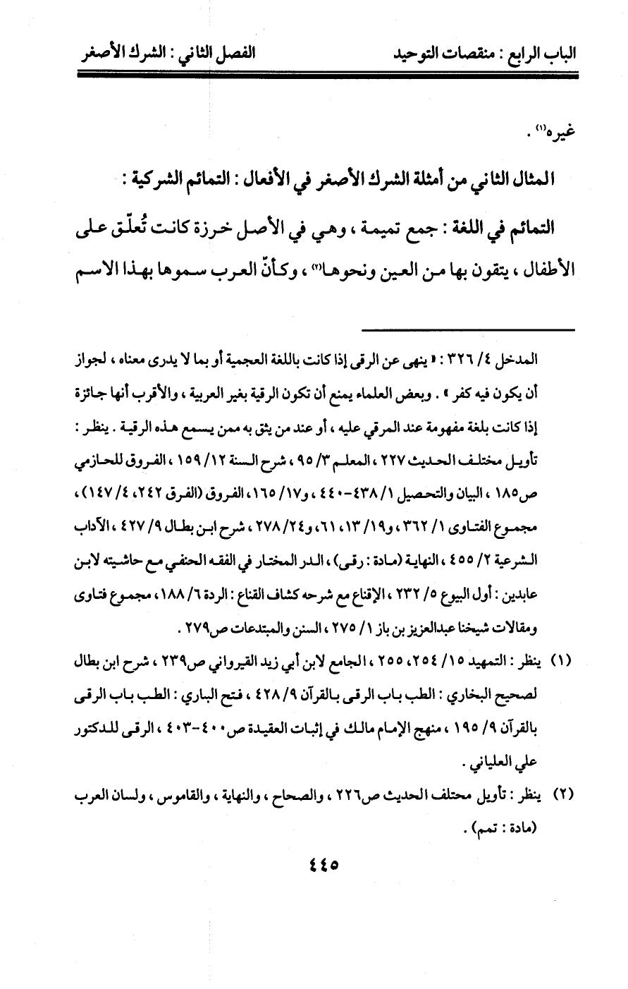 "1" الاستدلال على هذا المثال بقوله تعالى {وَضَرَبَ اللَّهُ مَثَلاً قَرْيَةً..} [النحل:112] فيه نظر، فإن الأقرب أن الآية في الكفر الأكبر، والقرية هي مكة، لما كفر أهلها بالنبي صلى الله عليه وسلم كما ورد عن كثير من المفسرين، أما ما رواه الطبري في تفسير هذه الآية عن حفصة رضي الله عنها من أن القرية هي المدينة النبوية لقتلهم عثمان رضي الله عنه فإسناده ضعيف.