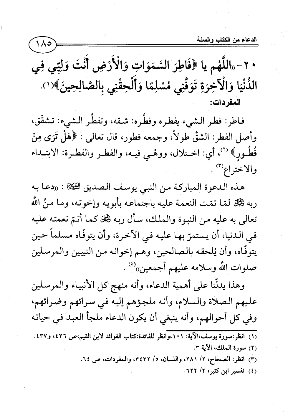 20 - ((اللَّهُم يا {فَاطِرَ السَّمَوَاتِ وَالْأَرْضِ أَنْتَ وَلِيِّي فِي الدُّنْيَا وَالْآخِرَةِ تَوَفَّنِي مُسْلِمًا وَأَلْحِقْنِي بِالصَّالِحِينَ} (¬1).