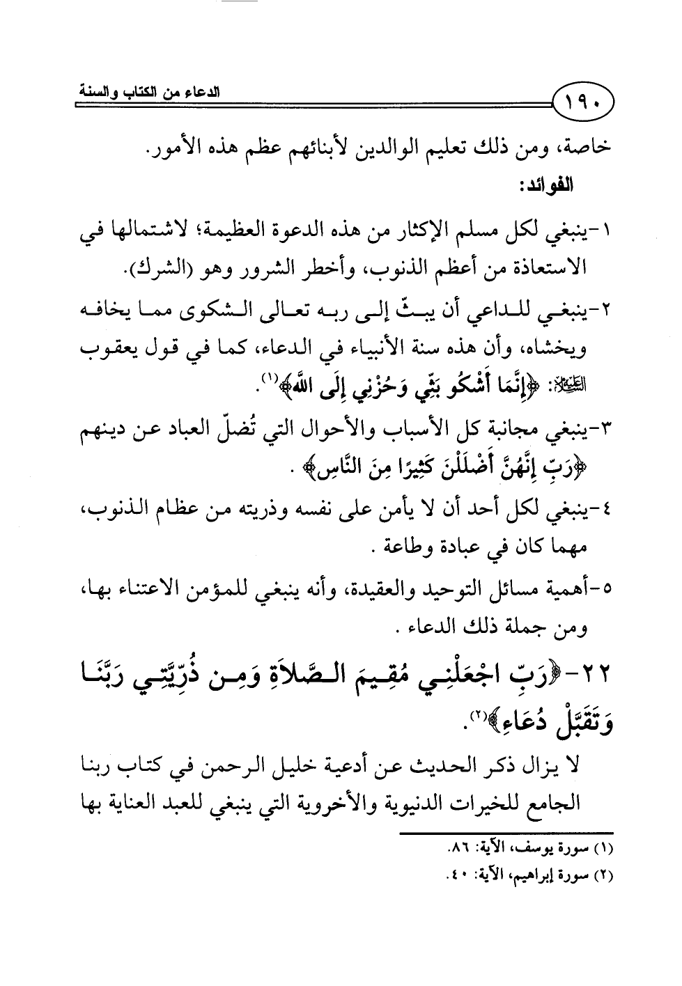 22 - {رَبِّ اجْعَلْنِي مُقِيمَ الصَّلاَةِ وَمِن ذُرِّيَّتِي رَبَّنَا وَتَقَبَّلْ دُعَاءِ} (¬2).
