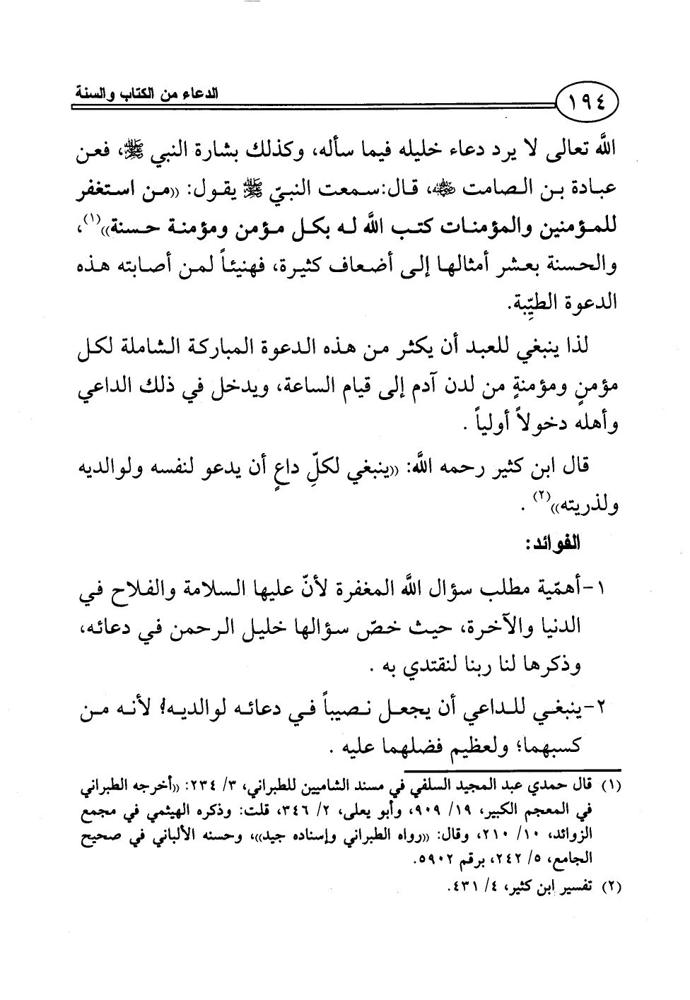 اللَّه تعالى لا يرد دعاء خليله فيما سأله، وكذلك بشارة النبي - صلى الله عليه وسلم -، فعن عبادة بن الصامت - رضي الله عنه -، قال: سمعت النبيّ - صلى الله عليه وسلم - يقول: ((من استغفر للمؤمنين والمؤمنات كتب اللَّه له بكل مؤمن ومؤمنة حسنة)) (¬1)، والحسنة بعشر أمثالها إلى أضعاف كثيرة، فهنيئاً لمن أصابته هذه الدعوة الطيِّبة.