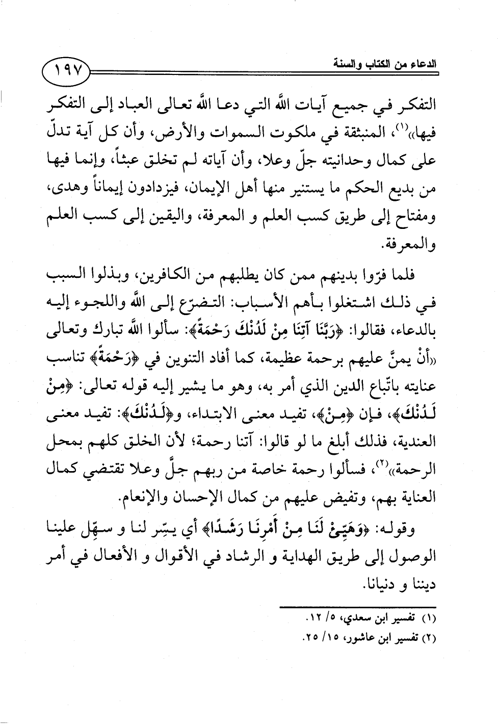فلما فرّوا بدينهم ممن كان يطلبهم من الكافرين، وبذلوا السبب في ذلك اشتغلوا بأهم الأسباب: التضرّع إلى اللَّه واللجوء إليه بالدعاء، فقالوا: {رَبَّنَا آتِنَا مِنْ لَدُنْكَ رَحْمَةً}: سألوا اللَّه تبارك وتعالى ((أنْ يمنَّ عليهم برحمة عظيمة، كما أفاد التنوين في {رَحْمَةً} تناسب عنايته باتّباع الدين الذي أمر به، وهو ما يشير إليه قوله تعالى: {مِنْ لَدُنْكَ}، فإن {مِنْ}، تفيد معنى الابتداء، و {لَدُنْكَ}: تفيد معنى العندية، فذلك أبلغ ما لو قالوا: آتنا رحمة؛ لأن الخلق كلهم بمحل الرحمة)) (¬2)، فسألوا رحمة خاصة من ربهم جلَّ وعلا تقتضي كمال العناية بهم، وتفيض عليهم من كمال الإحسان والإنعام.