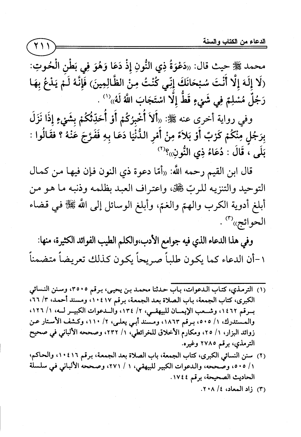 محمد - صلى الله عليه وسلم - حيث قال: ((دَعْوَةُ ذِي النُّونِ إِذْ دَعَا وَهُوَ فِي بَطْنِ الْحُوتِ: (لَا إِلَهَ إِلَّا أَنْتَ سُبْحَانَكَ إِنِّي كُنْتُ مِنْ الظَّالِمِينَ) فَإِنَّهُ لَمْ يَدْعُ بِهَا رَجُلٌ مُسْلِمٌ فِي شَيْءٍ قَطُّ إِلَّا اسْتَجَابَ اللَّهُ لَهُ)) (¬1).