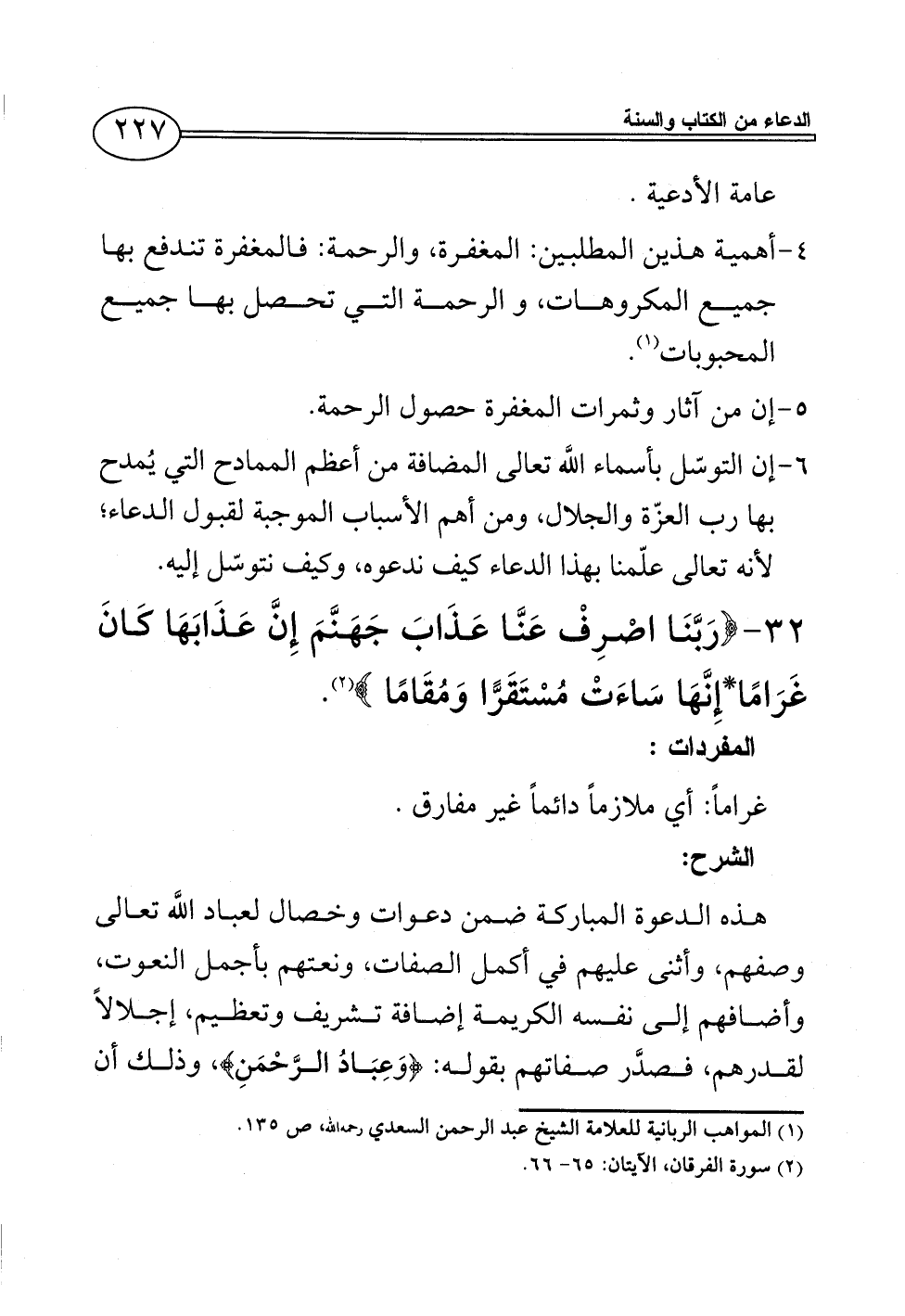 32 - {رَبَّنَا اصْرِفْ عَنَّا عَذَابَ جَهَنَّمَ إِنَّ عَذَابَهَا كَانَ غَرَامًا*إِنَّهَا سَاءَتْ مُسْتَقَرًّا وَمُقَامًا} (¬2).