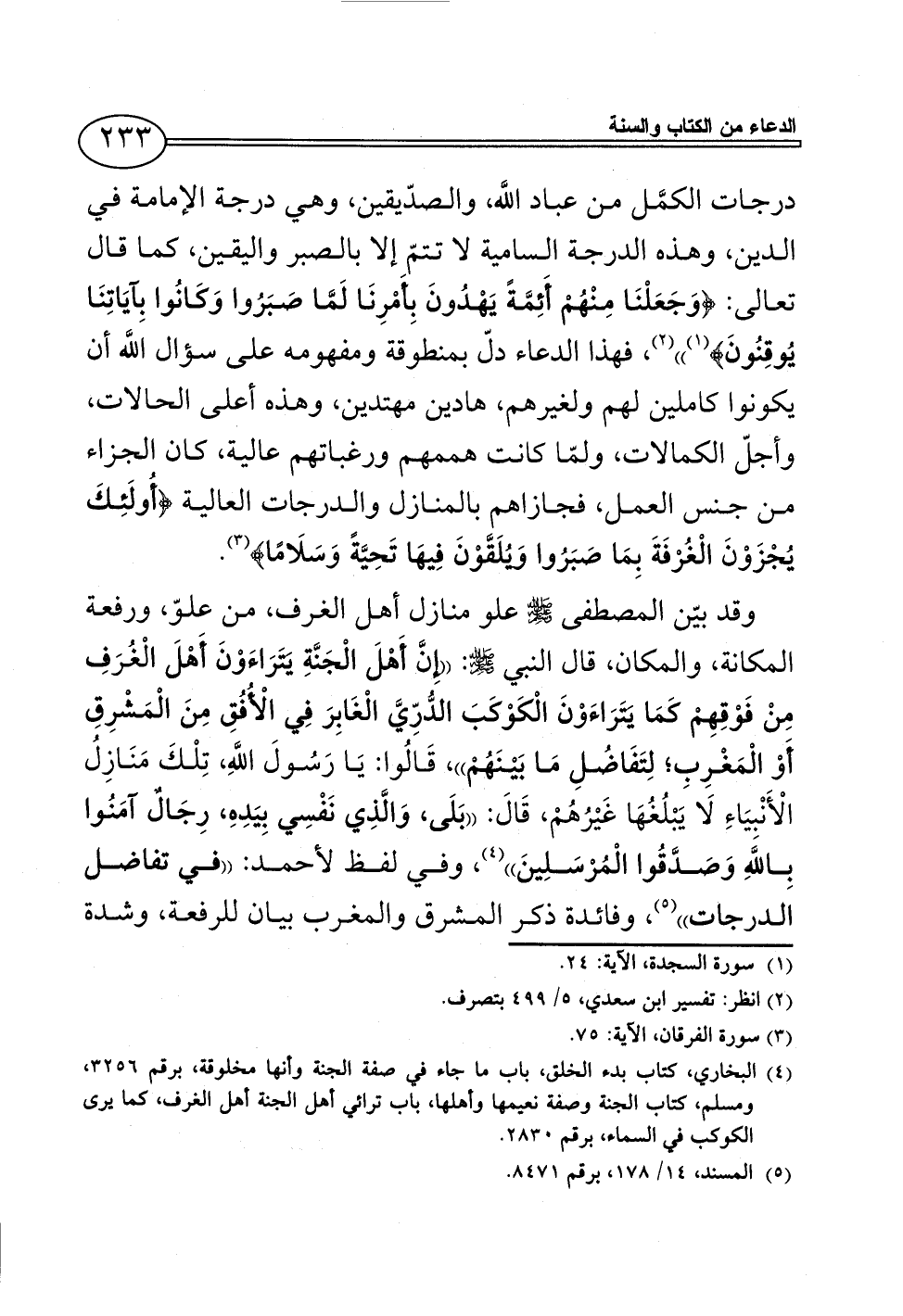 درجات الكُمَّلِ من عباد اللَّه، والصدّيقين، وهي درجة الإمامة في الدين، وهذه الدرجة السامية لا تتمّ إلا بالصبر واليقين، كما قال تعالى: {وَجَعَلْنَا مِنْهُمْ أَئِمَّةً يَهْدُونَ بِأَمْرِنَا لَمَّا صَبَرُوا وَكَانُوا بِآيَاتِنَا يُوقِنُونَ} (¬1)) (¬2)، فهذا الدعاء دلّ بمنطوقة ومفهومه على سؤال اللَّه أن يكونوا كاملين لهم ولغيرهم، هادين مهتدين، وهذه أعلى الحالات، وأجلّ الكمالات، ولمّا كانت هممهم ورغباتهم عالية، كان الجزاء من جنس العمل، فجازاهم بالمنازل والدرجات العالية {أُولَئِكَ يُجْزَوْنَ الْغُرْفَةَ بِمَا صَبَرُوا وَيُلَقَّوْنَ فِيهَا تَحِيَّةً وَسَلَامًا} (¬3).