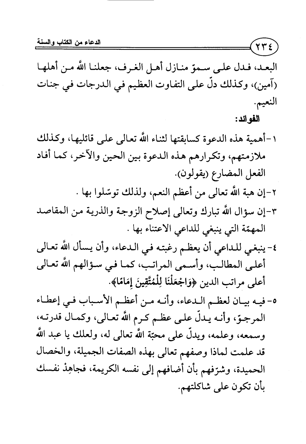 4 - ينبغي للداعي أن يعظم رغبته في الدعاء، وأن يسأل اللَّه تعالى أعلى المطالب، وأسمى المراتب، كما في سؤالهم اللَّه تعالى أعلى مراتب الدين {وَاجْعَلْنَا لِلْمُتَّقِينَ إِمَامًا}.