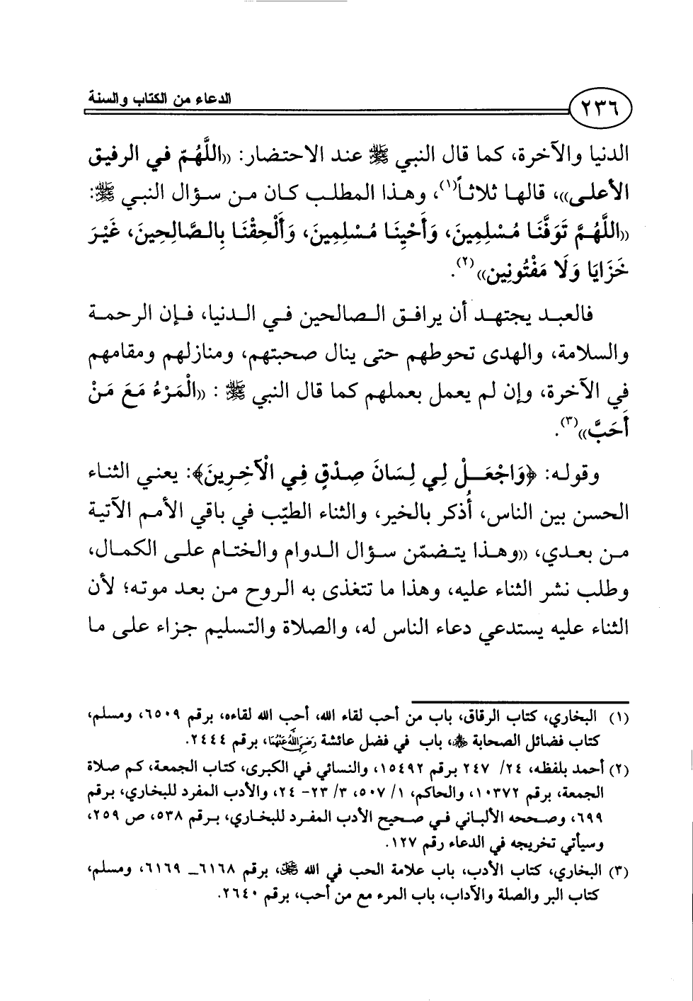 الدنيا والآخرة، كما قال النبي - صلى الله عليه وسلم - عند الاحتضار: ((اللَّهُمّ في الرفيق الأعلى))، قالها ثلاثاً (¬1)، وهذا المطلب كان من سؤال النبي - صلى الله عليه وسلم -: ((اللَّهُمَّ تَوَفَّنَا مُسْلِمِينَ، وَأَحْيِنَا مُسْلِمِينَ، وَأَلْحِقْنَا بِالصَّالِحِينَ، غَيْرَ خَزَايَا وَلَا مَفْتُونِين)) (¬2).