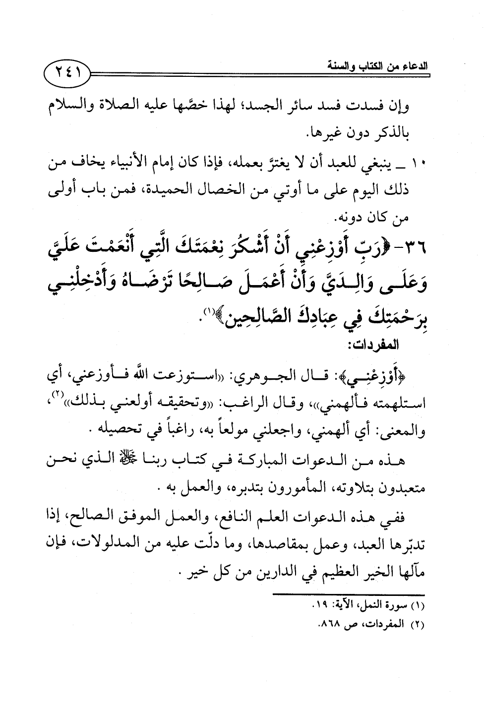 36 - {رَبِّ أَوْزِعْنِي أَنْ أَشْكُرَ نِعْمَتَكَ الَّتِي أَنْعَمْتَ عَلَيَّ وَعَلَى وَالِدَيَّ وَأَنْ أَعْمَلَ صَالِحًا تَرْضَاهُ وَأَدْخِلْنِي بِرَحْمَتِكَ فِي عِبَادِكَ الصَّالِحِين} (¬1).
