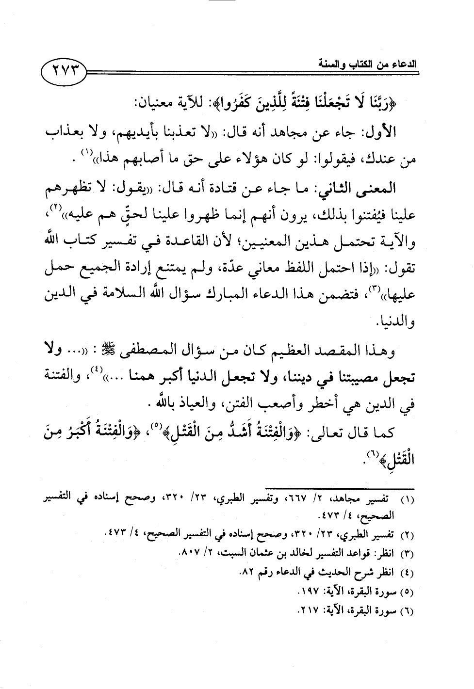 علينا فيُفتنوا بذلك، يرون أنهم إنما ظهروا علينا لحقٍّ هم عليه)) (¬2)، والآية تحتمل هذين المعنيين؛ لأن القاعدة في تفسير كتاب اللَّه تقول: ((إذا احتمل اللفظ معاني عدّة، ولم يمتنع إرادة الجميع حمل عليها)) (¬3)، فتضمن هذا الدعاء المبارك سؤال اللَّه السلامة في الدين والدنيا.